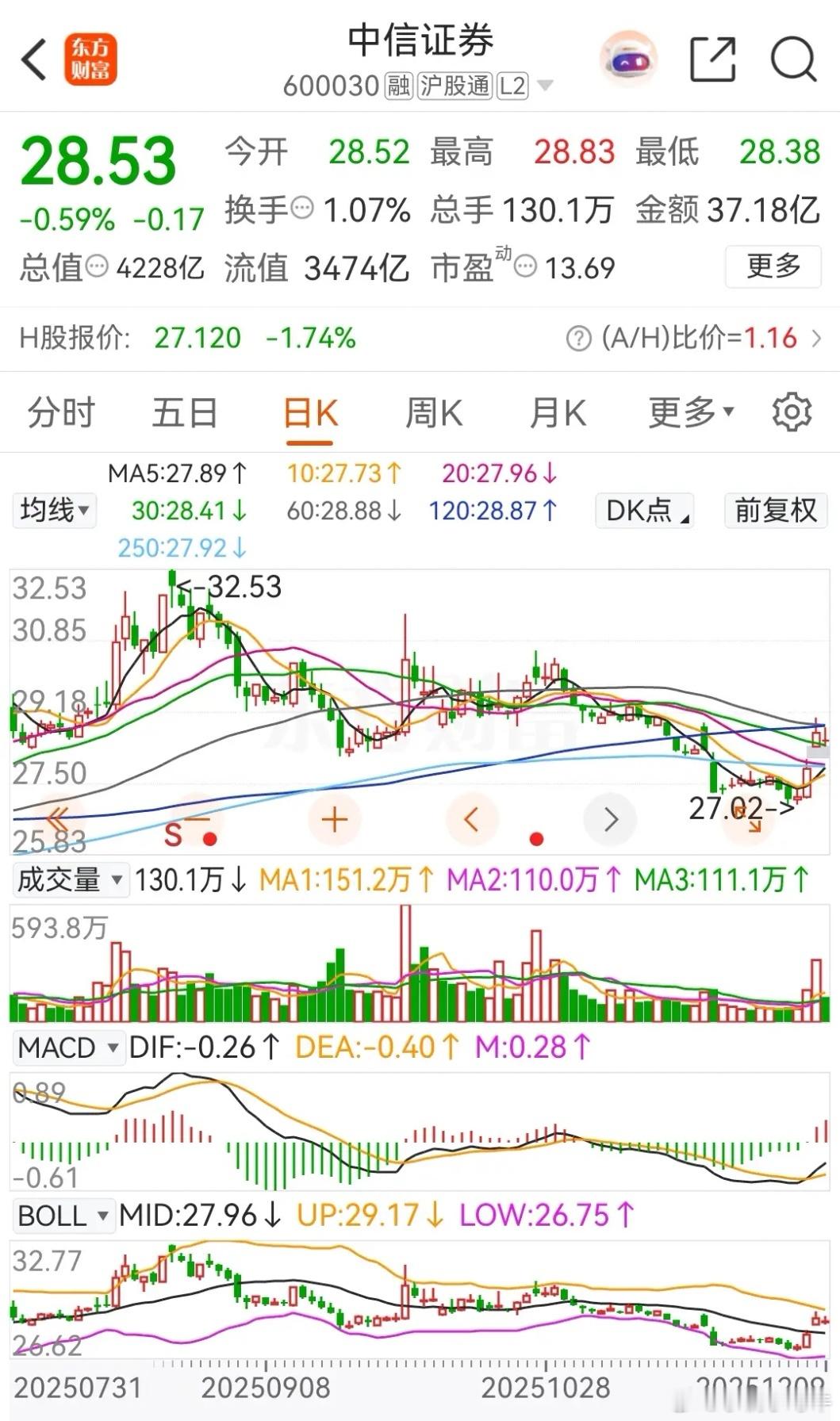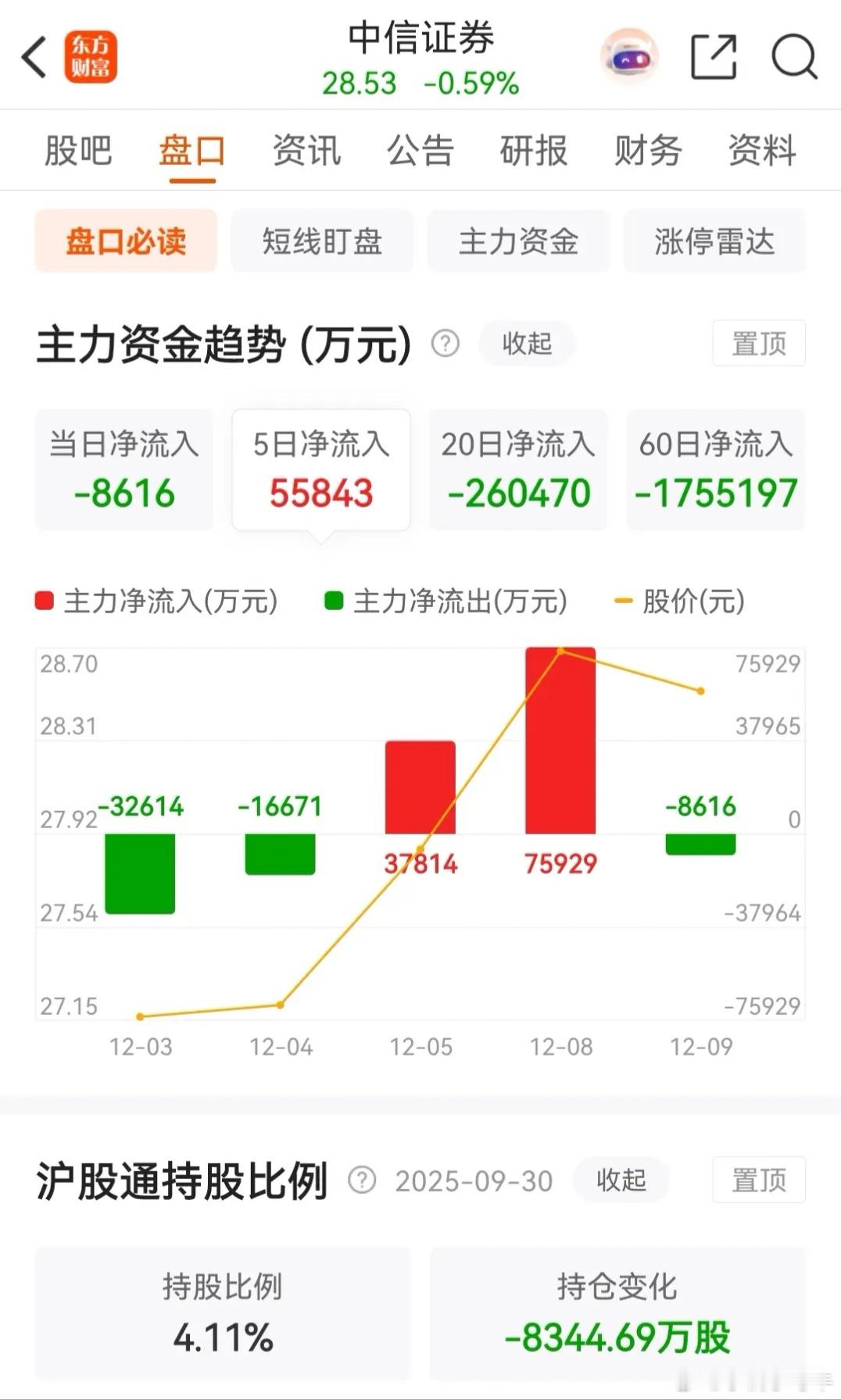 券茅东方财富和券商一哥中信证券今天调整了,收盘时二者均是收出了缩量十字星线,且都被主力资金净卖出。券茅今天早盘低开冲高后回落,下午则是探底回升,最终以缩量十字星报收,跌幅为1.52%,收盘报价为23.28元。在资金流向上,今天被主力资金净卖出4.0634亿元,近五个交易日则是合计被净卖出了10.4064亿元。券商一哥今天的走势同券茅一致,也是以缩量十字星报收,收盘时股价下跌了0.59%,收盘报价为28.53元。在资金流向上,今天被主力资金净卖出了0.8616亿元,但近五个交易日则是被主力资金合计净买入了5.5843亿元,不像券茅那样是被净卖出的。从走势上看,券商一哥今天虽然收出了缩量十字星,但并未像券茅那样回补了昨日跳空高开留下的缺口,整体走势还是比较强势的。至于更详细的技术分析,可以查阅上一篇中关于券商概念板块的走势分析。对于券茅和券商一哥来说,短期的催化因素有,一是政策红利:今日结算费率下调、险资入市扩容(释放1086亿增量资金),直接利好经纪与两融业务;二是估值修复:券商板块PB仅1.52倍(历史40%分位),ROE预期达70%分位,剪刀差修复空间显著。
