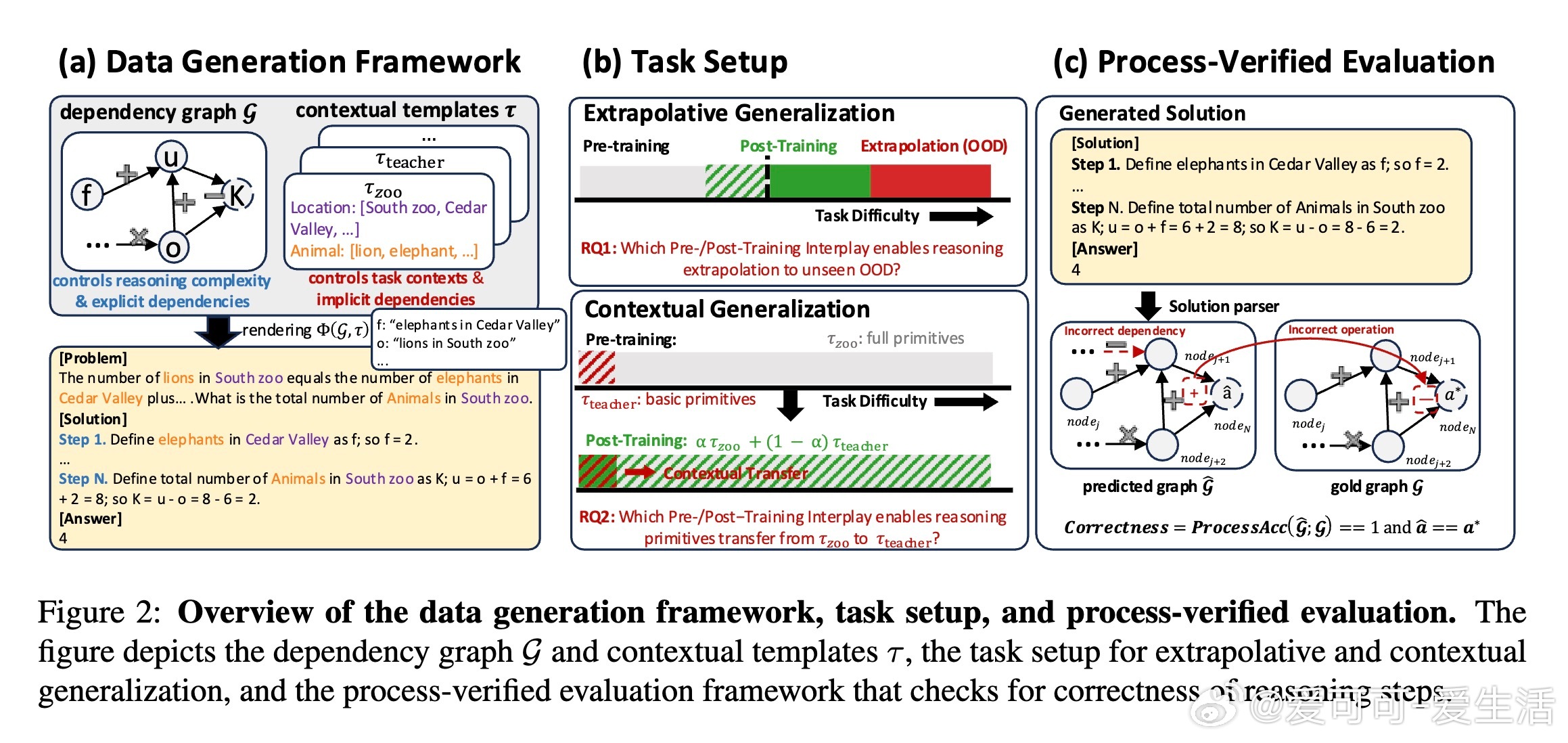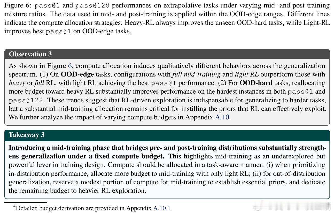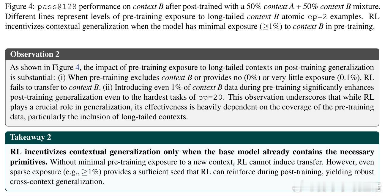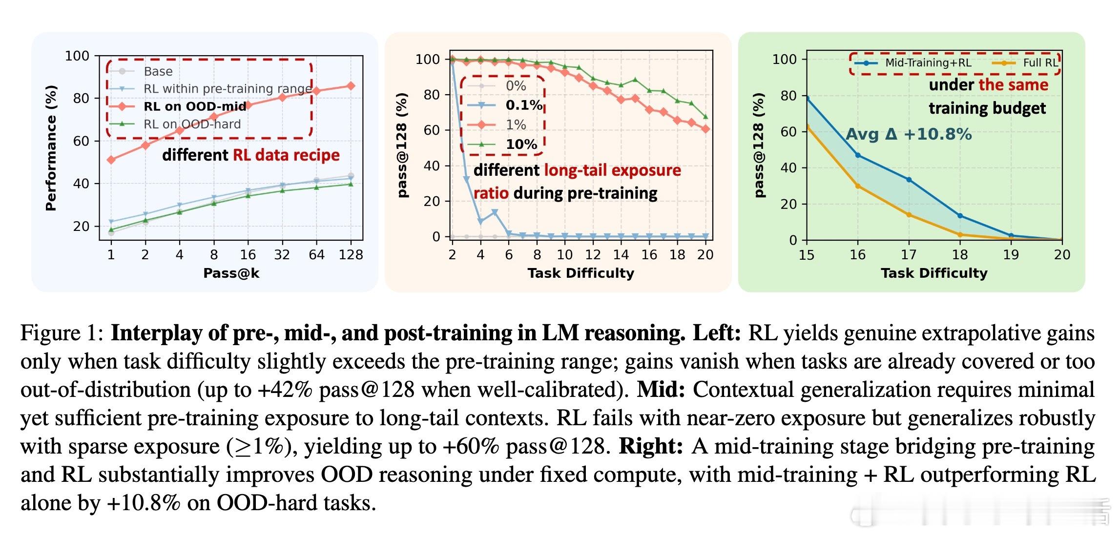 [CL]《On the Interplay of Pre-Training, Mid-Training, and RL on Reasoning Language Models》C Zhang, G Neubig, X Yue [CMU] (2025) 近期强化学习(RL)技术在提升语言模型推理能力上表现突出,但是否真能超越预训练阶段所获得的能力,一直存在争议。原因在于现代训练流程缺乏可控性:预训练语料庞大且不透明,中间训练(mid-training)阶段常被忽视,RL目标与模型已有知识的复杂交互难以解析。为破解这一难题,本文构建了一个完全可控的实验框架,利用合成推理任务、明确的原子操作和可解析的推理步骤,系统操控预训练、中间训练和RL后训练的数据分布,精确拆解各阶段对模型推理能力的因果贡献。他们从两个维度评估模型推理能力:一是“深度泛化”,即模型能否解决比预训练更复杂的组合推理任务;二是“广度泛化”,即模型是否能迁移推理能力到不同表述上下文。实验证明:1. RL带来的真正能力提升(pass对于上下文泛化,模型必须在预训练阶段至少接触过相关的基础推理原语。即使极少量(≥1%)的预训练覆盖,也足以让RL在后训练阶段实现跨上下文的鲁棒转移。3. 中间训练作为连接预训练和RL后训练的桥梁,极大提升了模型的推理表现,尤其在计算资源固定的情况下,结合中间训练和RL的混合训练效果远超单独使用RL。4. 在奖励设计中引入过程级监督(即不仅奖励最终答案正确,还奖励中间推理步骤的正确性)有效抑制了“奖励劫持”现象,提升推理的真实性和泛化能力。该研究不仅澄清了预训练、中间训练与RL在推理能力塑造中的相互作用,也为设计更高效的训练策略提供了实证指导:- 预训练应覆盖关键基础推理原语,确保RL后训练有坚实基础可依赖;- RL数据应聚焦于模型“能力边缘”的任务,避免资源浪费和学习停滞;- 适当分配计算预算于中间训练和RL后训练,兼顾稳定性与探索性;- 奖励函数应兼顾结果正确与过程合理,促进模型生成更真实可信的推理路径。这项工作以严谨的合成数据和可验证的推理过程为基础,排除数据污染和偶然正确的干扰,确保研究结论具有高度说服力和实用价值。它为理解和提升语言模型的推理能力开辟了清晰路径,推动了智能系统在复杂推理任务中的稳健表现。详细内容见论文 arxiv.org/abs/2512.07783。