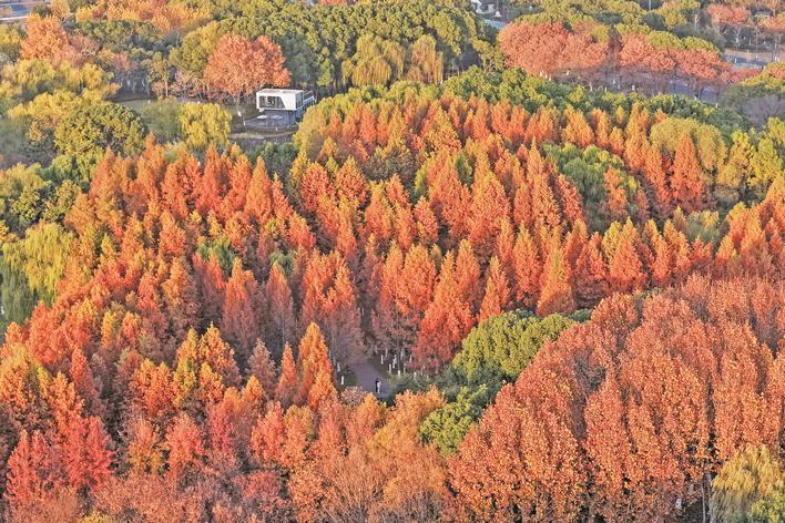 眼下,嘉兴植物园已褪去了往日的葱郁,以多元植被勾勒出别样生机。水杉、鸡爪槭等植物似燃烧的火焰点亮园区,与常青植被的翠绿相映成趣,绘就了一幅层次丰富的冬日画卷。