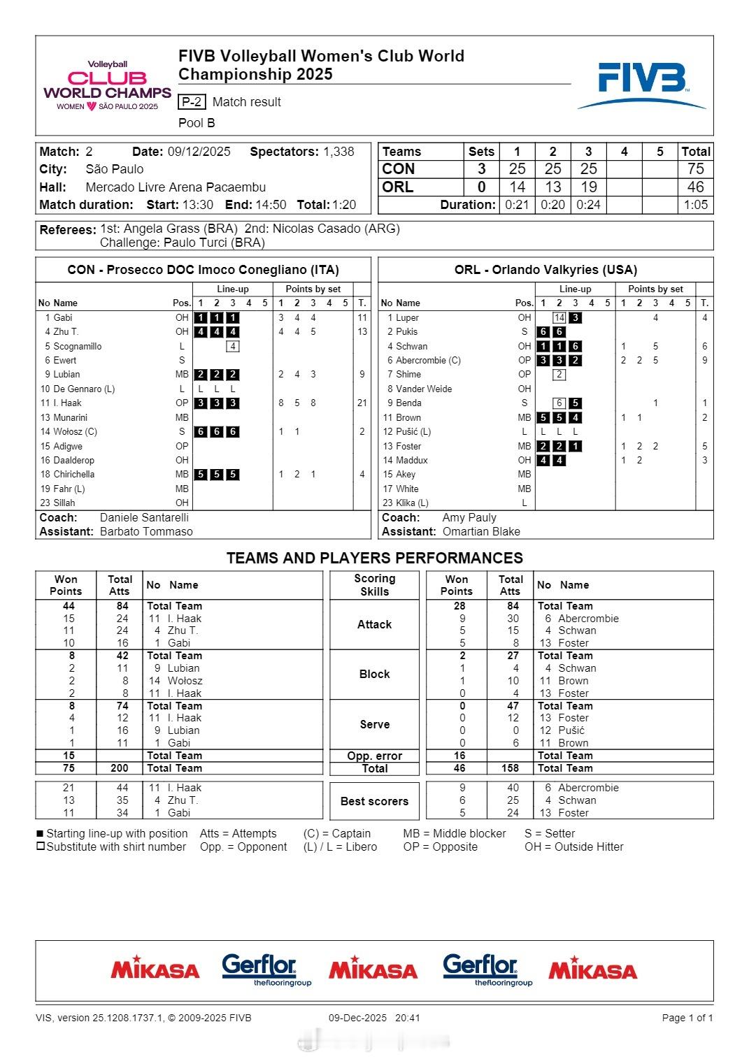 【女排世俱杯科内利亚诺首战轻取奥兰多 朱婷13分】国际排坛战报速递中国排球留洋动态 12月9日巴西圣保罗,2025女排世俱杯B组,意大利科内利亚诺3-0(25-14/25-13/25-19)轻取首次参赛的美国奥兰多女武神,首战告捷。哈克21分、朱婷13分(24扣11中1拦1发)、加比11分,奥兰多阿贝克隆比得到本队最高的9分。