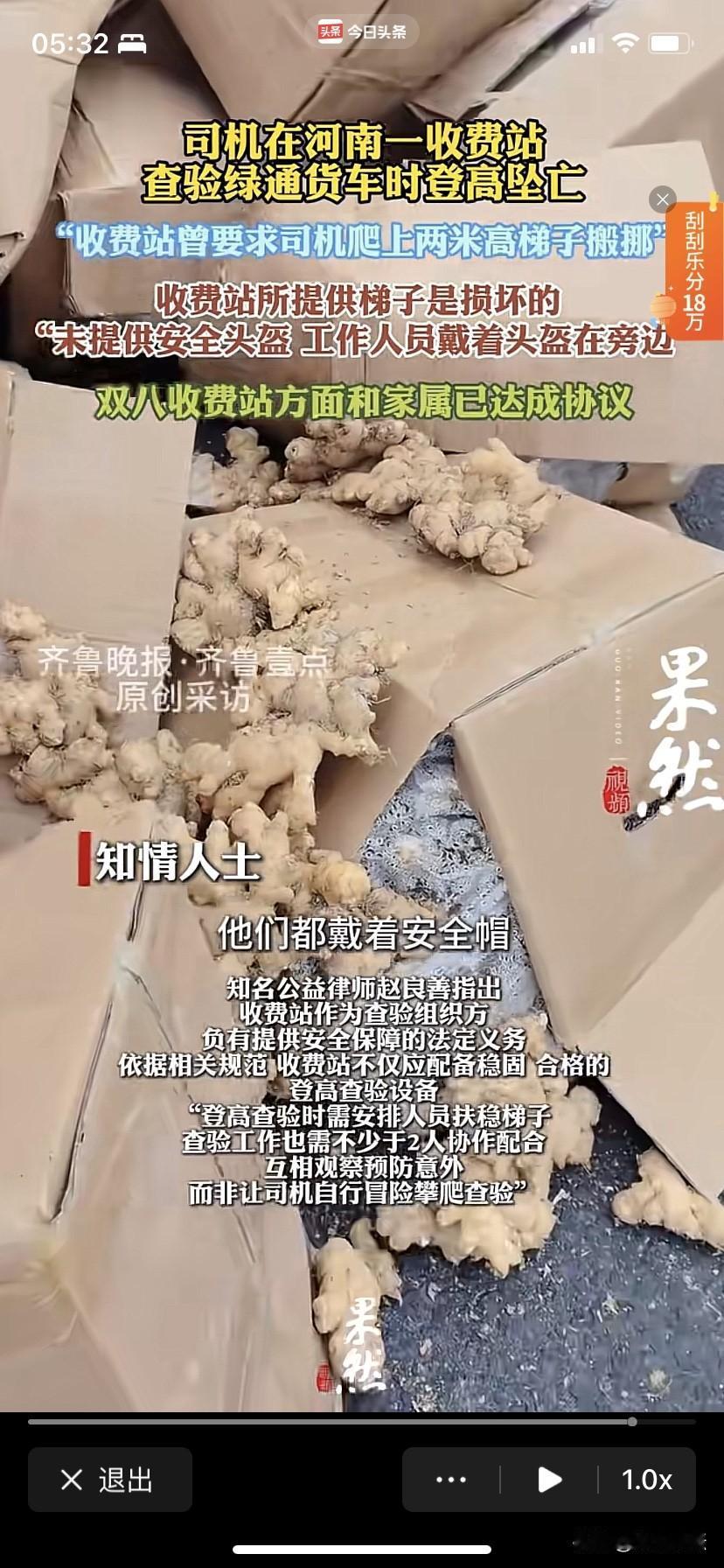 山东大货车司机过收费站时被要求登高查验不慎坠落身亡。 2025年12月9日,一位来自山东聊城阳谷的大货车司机正拉一车姜运往农产品市场,当货车通过河南双八收费站时,货车司机被工作人员要求爬上2米高货车查验时不慎坠亡。 据知情人士透露,他们经过收费站时,工作人员要求司机自己爬上2米高的梯子打开箱子查看货物,但并未给司机提供安全,头盔工作人员却头戴头盔站在旁边观看,他们提供的梯子装有移动轮,但梯子脚固定扣已经损坏,司机在搬挪箱子时梯子发生位移,导致司机身体倾斜不慎坠亡。 据知名公益律师称:收费站作为查验方应负有提供安全保障的法定义务,依据相关规范,查验方不仅应该配备合格的查验设备,登高人员查验时需要收费人员扶稳梯子,并要求查验人员不应少于两人协助配合互相观看,以防发生意外。 目前,赔偿善后事宜正在进行中,一条鲜活的生命瞬间就消失了,一个坏梯子就要了一条人命。 这起事故反映出收费站两大问题:一是工作人员在司机登高时没有扶梯子也没有提供安全帽,是对他人生命的漠视,二是收费站梯子设备破损没有及时更换。如果这些工作都做好了,这起事故就不会发生。[祈祷][祈祷]