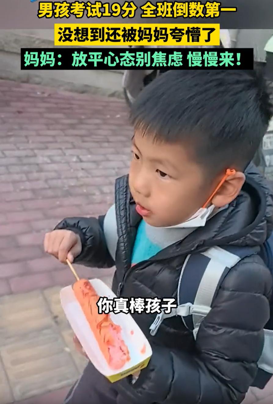 吵翻天!湖北,一名小学生考试考了19分,全班倒数第一,可妈妈知道后不但没打没骂,还各种夸赞奖励,直接把孩子都说的不好意思了,而如此的教育方式,也引起了不少家长的讨论 当天,妈妈去接儿子放学,顺手在校门口买了根烤肠递给他。孩子拿着烤肠,边走边吃,妈妈随口问起,今天考试感觉怎么样? 儿子声音不大,说都不会。妈妈听了,也没急,反而笑着接话:都不会啊,那不会是零分吧? 儿子这时倒坦然了,抬头说:19分 要是换作别的家长,听到这个分数,可能脸色已经变了。但这位妈妈没有。她先是愣了一下,接着嘴角就扬起来:19分?这么高!你居然能考19分啊? 儿子显然没料到这个反应,有点不好意思,小声补了一句:19分是全班最低的 妈妈点点头,语气还是很轻松:最低的也没事,你真棒!咱们慢慢来 孩子听着,手里的烤肠都忘了吃 事后,这段对话被分享到网上,果然引来了各种声音 有人不理解:不批评可以理解,但夸?夸的点在哪里?孩子自己都懵了 也有人很感慨:这孩子有福气,遇到这样的妈妈。不管以后学习怎么样,至少他心里是暖的 其实,跳出“分数”这个事来看,这位妈妈做的,并不是在夸“19分”这个结果,而是在接住那个考砸了的孩子 想想看,一个考了倒数第一的孩子,放学路上心里有多沉。他可能早就准备好了被骂,被嫌弃,甚至被比较。但妈妈没有给他预设的剧情。她给的是一根烤肠,一句玩笑,和一个“不管考多少分,你都可以告诉我”的安心、 当然,这种方式也有代价,就是家长后面要做更多的陪伴和调整,不能停在嘴上宽松。毕竟接受孩子,不等于放任孩子。孩子不是靠一句夸就能起飞的,但这句夸能让他不掉下去