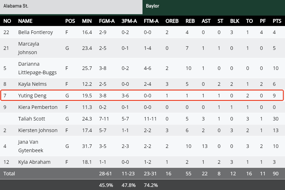 NCAA常规赛:邓雨婷9分1板,贝勒大学大胜阿拉巴马州立大学