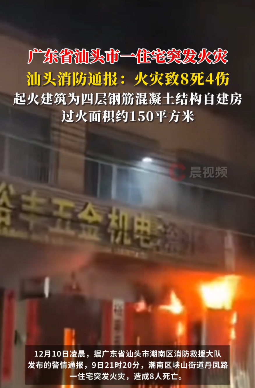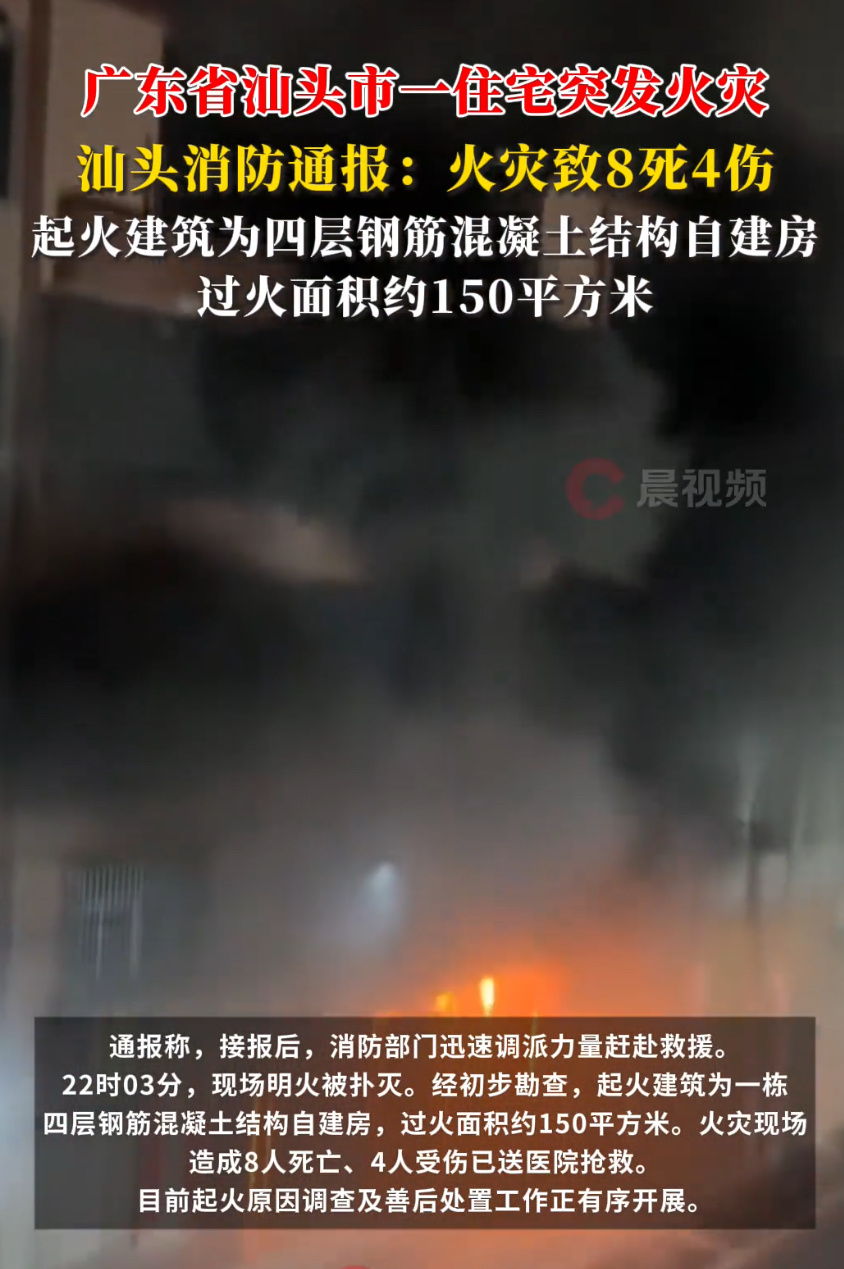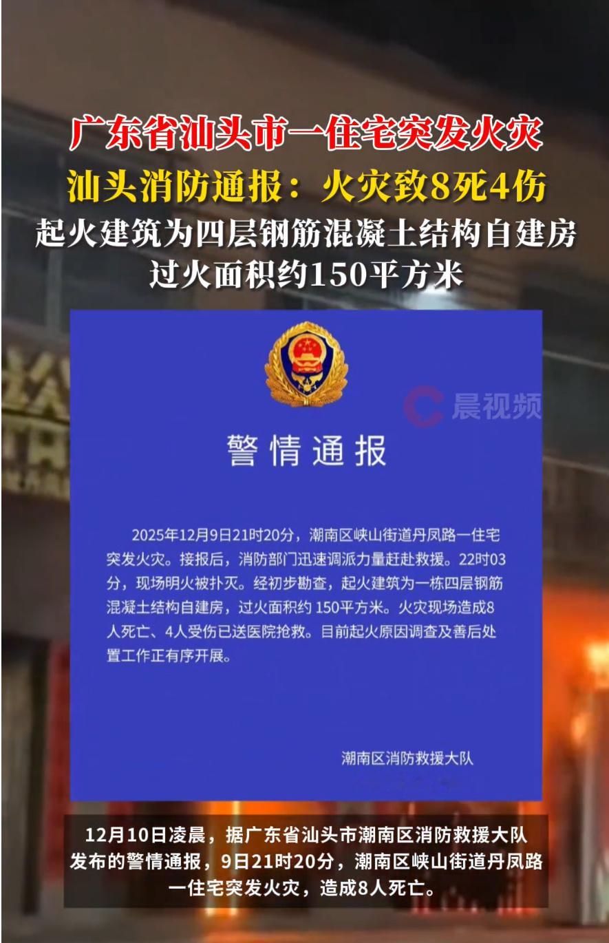 广东一住宅突发火灾致8死深夜汕头潮南的那场火灾, 四层自建房21时20分起火,消防43分钟拼力扑救,却还是没能留住8条生命,4人受伤送医的消息更让人揪心。这栋“下店上宅”的房子,住着人又堆着货物,像很多老街自建房一样,可能藏着电路老化、通道堵塞的隐患。最近同类事故总在发生,不管是香港火灾还是深圳爆炸,都在提醒我们防火真的不能大意。冬季天干物燥,家里“三清三关”一定要记牢:清杂物、关电源火源气源,再备上灭火器、规划好逃生路。希望这样的悲剧别再重演,也愿逝者安息、伤者早日康复🙏 微观时评