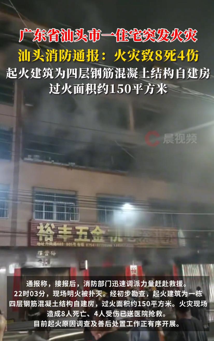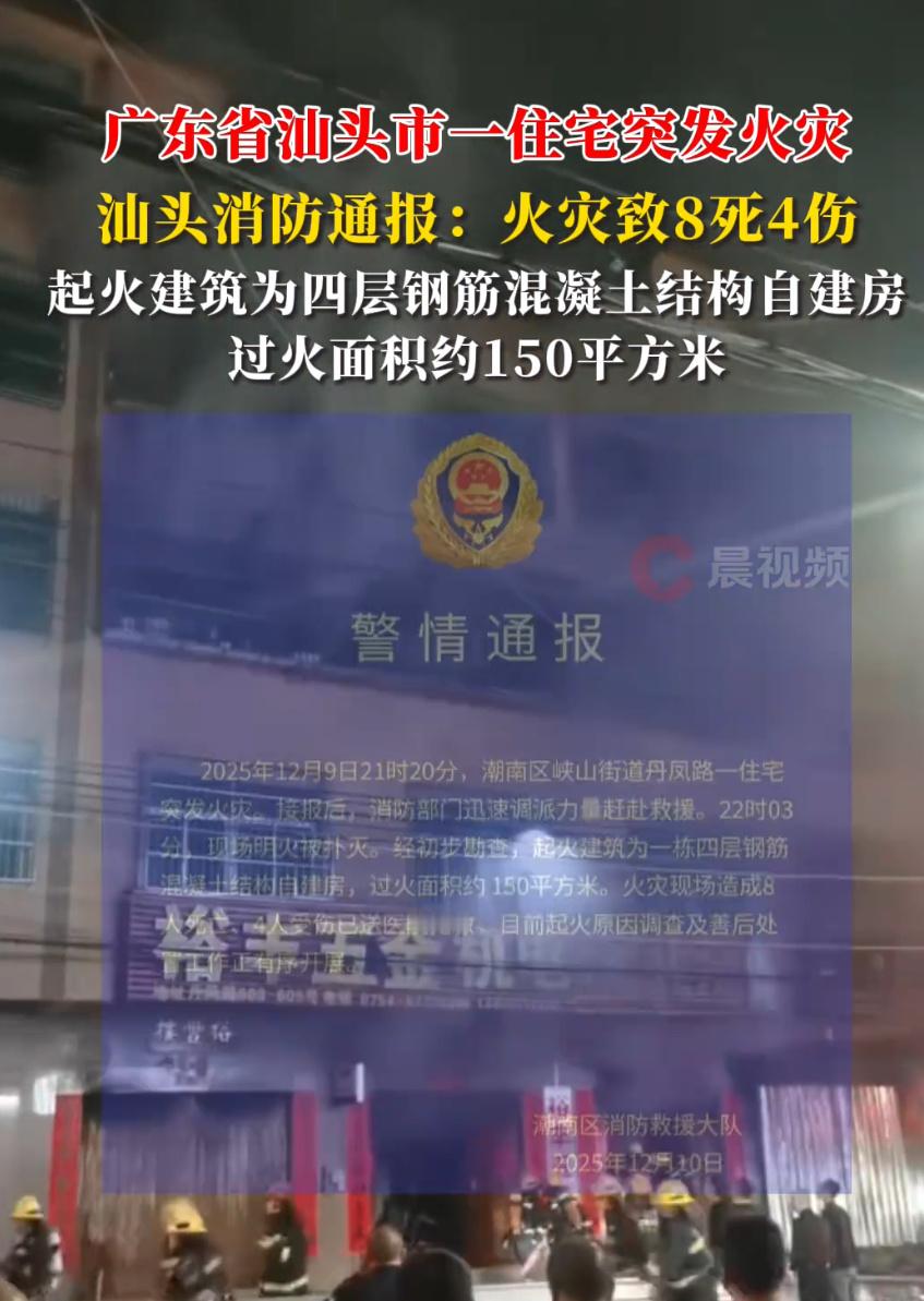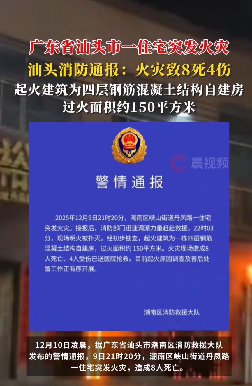 广东一住宅突发火灾致8死深夜汕头潮南的那场火灾, 四层自建房21时20分起火,消防43分钟拼力扑救,却还是没能留住8条生命,4人受伤送医的消息更让人揪心。这栋“下店上宅”的房子,住着人又堆着货物,像很多老街自建房一样,可能藏着电路老化、通道堵塞的隐患。最近同类事故总在发生,不管是香港火灾还是深圳爆炸,都在提醒我们防火真的不能大意。冬季天干物燥,家里“三清三关”一定要记牢:清杂物、关电源火源气源,再备上灭火器、规划好逃生路。希望这样的悲剧别再重演,也愿逝者安息、伤者早日康复🙏 微观时评