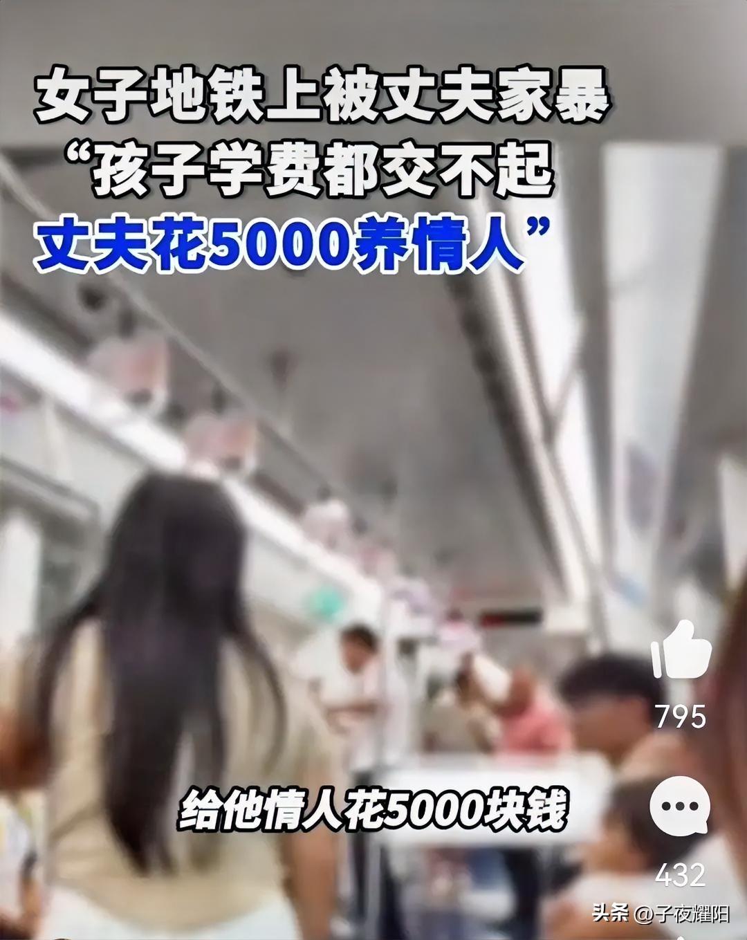 某地一地铁上,两夫妻不知为何突然吵起来,男子没有控制住怒火,当场就在地铁对妻子一顿暴揍,妻子怒斥丈夫孩子学费都交不起,还有钱养情人。这不明摆着他宁可拿五千块来养情人,也不愿意拿来给孩子交学费嘛。而且这女人既然都知道丈夫在外养情人,也不给家里和孩子,还选择跟他生活在一起,这不是自找苦吃吗?早点结束了不是更好,我相信孩子他也不想要这样的爸爸。