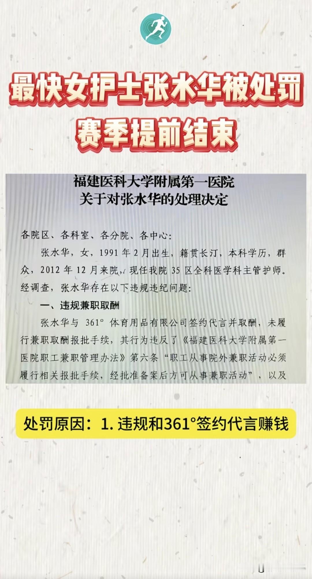 “最快女护士”张水华被医院处罚了,处罚原因包括违规与361签约,为跑马多次虚假理