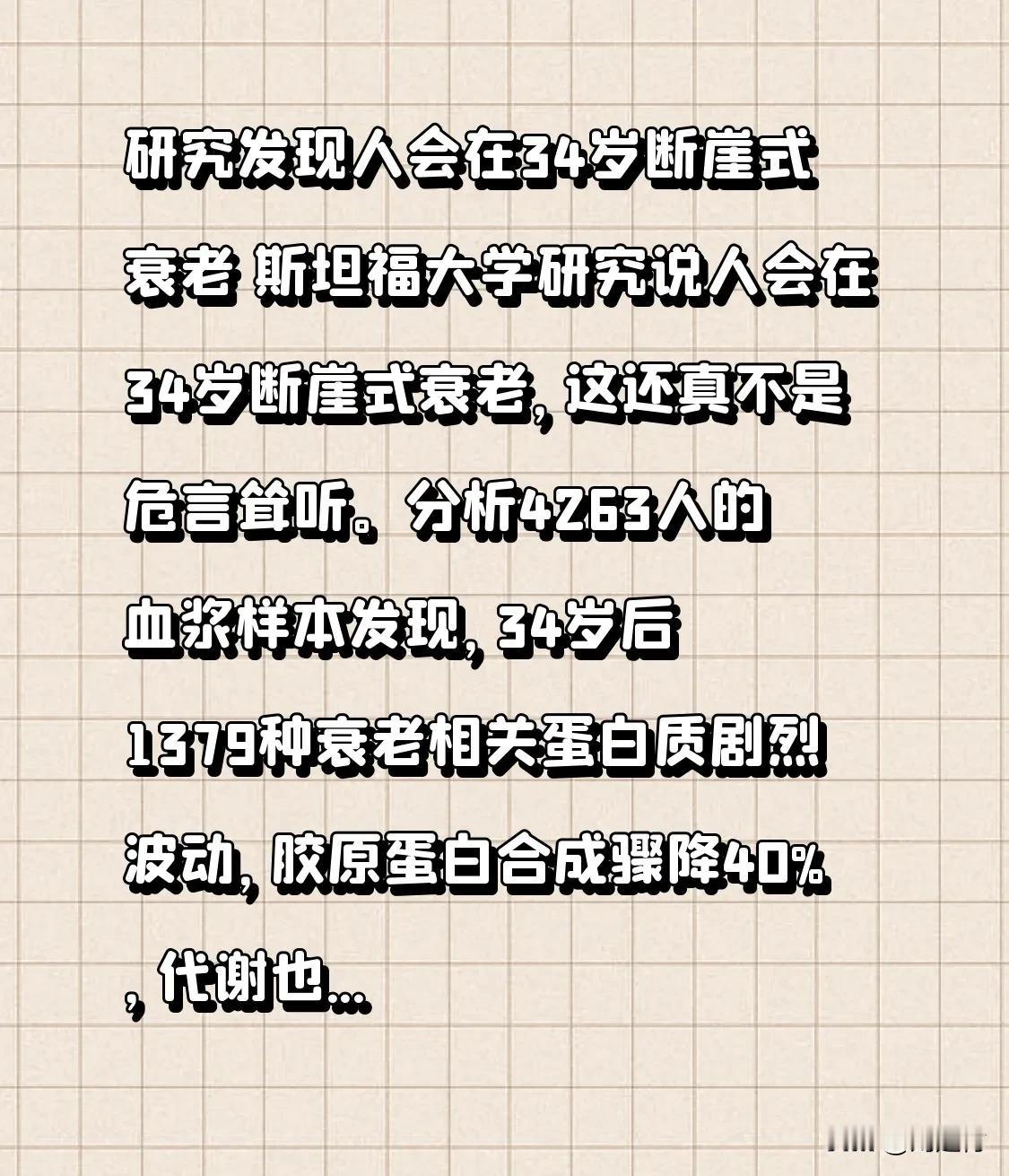 研究发现人会在34岁断崖式衰老 研究表明,人会在34岁经历断崖式衰老。斯坦福大学的研究证实,这并非危言耸听。分析4263人的血浆样本发现,34岁后,1379种衰老相关蛋白质剧烈波动,胶原蛋白合成骤降40%,代谢也下降10%-15%。 仔细想想,34岁左右事业和家庭压力大,熬夜、饮食不规律成了常态,身体机能自然下滑得快。我身边就有朋友,过了34岁,皮肤松弛、法令纹加深,熬夜后恢复慢,肚子上赘肉增多。 不过不必慌张,每周进行3次中等强度运动,多吃含维C和蛋白质的食物,做好防晒,规律作息,就能延缓衰老。34岁是“健康提醒”,并非衰老终点。 衰老 人类衰老 女生衰老 男女衰老差异 加快衰老