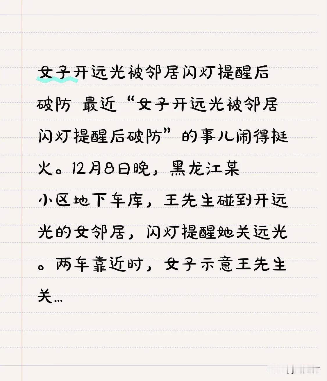 女子开远光被邻居闪灯提醒后破防 女子开远光被邻居闪灯提醒后破防 近日,“女子开远光被邻居闪灯提醒后破防”一事引发广泛关注。12月8日晚,在黑龙江某小区地下车库,王先生碰到开远光的女邻居,便闪灯示意其关掉远光。两车靠近时,女子示意王先生关灯,他照做将灯全关,可女子车灯却一直未变。 本以为事情就此平息,没想到女子竟上门咆哮近一小时,把王先生家孩子都吓哭了。王先生公开行车记录仪自证,显示自己一直使用近光。视频24小时播放量达2.8亿。网友还将女子照片与“傅首尔”面相联系。这女子开远光还蛮不讲理,着实令人无语,太影响邻里和谐。 后车远光 夜间开远光 汽车防追尾闪灯 后车碰撞预警 预防追尾灯