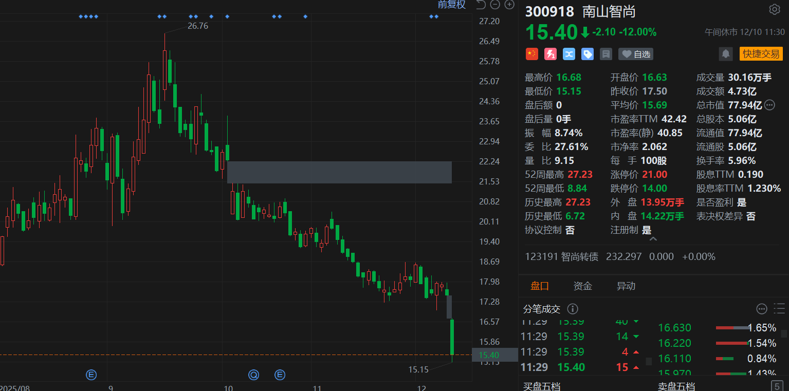 南山智尚(300918.SZ)午间大幅收跌12%,低见15.15元刷新调整新低,总市值77.94亿元。消息上,南山智尚约7142.86万股限售股将于12月10日(今日)解禁,占公司发行总股本的14.11%,解禁股类型为定向增发机构配售股份。有分析称,一般而言,限售股解禁后会有一部分股份进入市场流动,供给增加容易导致股价下跌。