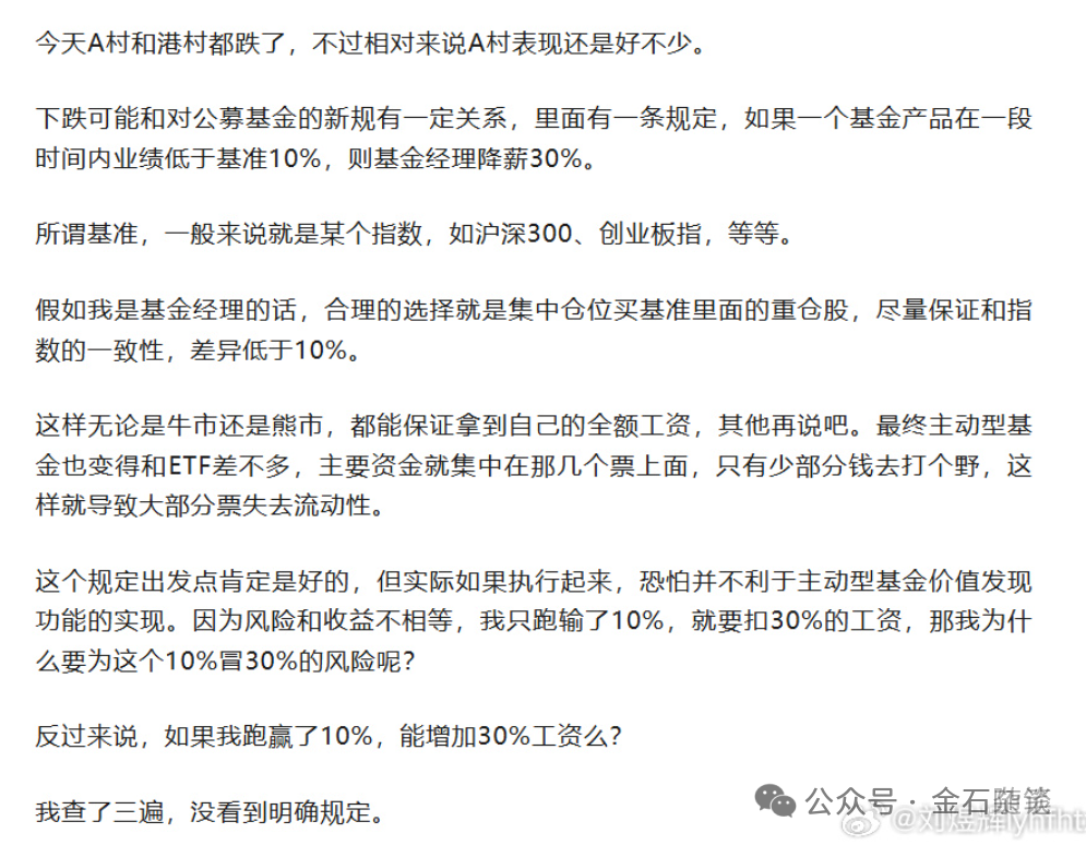 还有一点值得关注:据刘煜辉转载的一段话:公募新规对3年内业绩低于基准10%,基金经理则降薪30%,这促使基金经理将仓位紧跟基准指数,且重仓基准中的重仓股,比如算力类、人工智能类的基金,则重仓易中天、胜宏这些龙头。