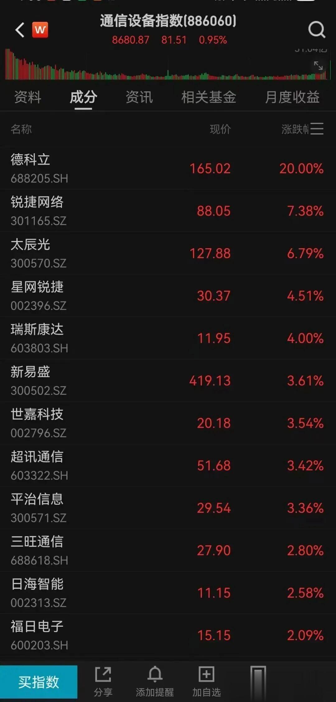 就在今日,算力股继续走高,德科立20cm涨停,锐捷网络和太辰光等大涨超6%,中际旭创再度暴涨6%,股价突破600元。