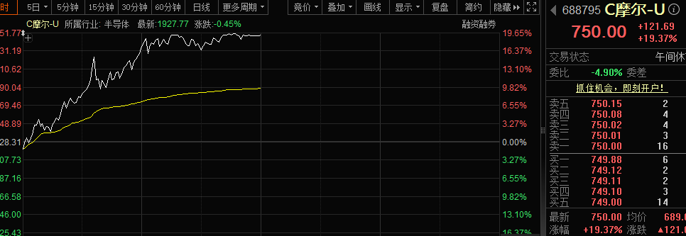 今日(12月10日),AI芯片“新贵”摩尔线程(股票简称“C摩尔-U”)开盘后震荡拉升,早盘涨幅超过19%,股价达到750元,市值超过3500亿元。