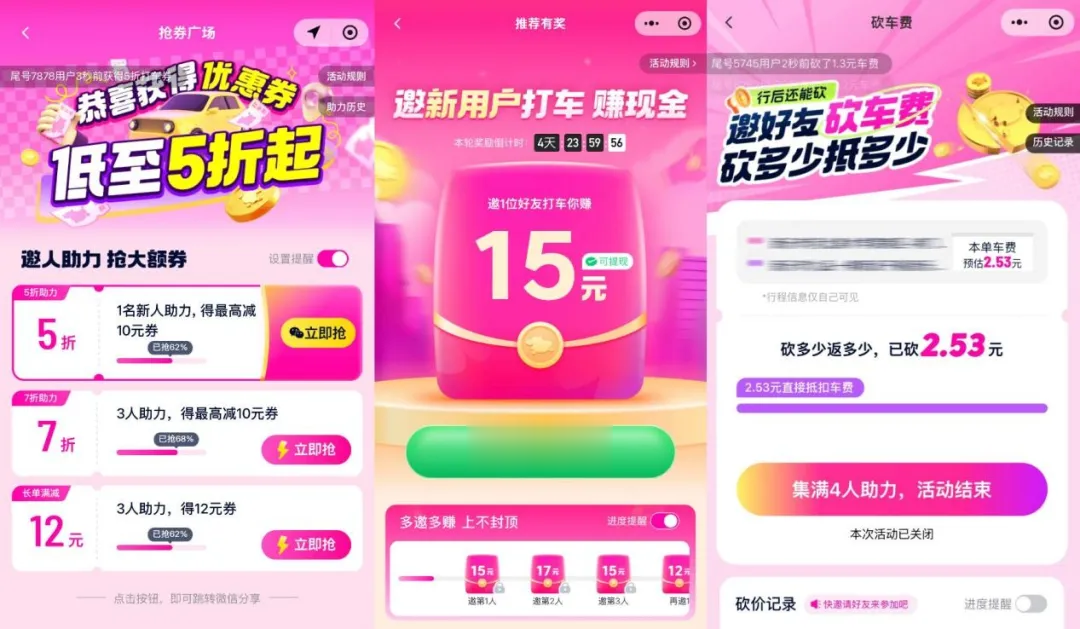 作为滴滴旗下的子品牌,它从诞生之初就复刻了“拼多多式”的社交营销——新人注册得优惠券、邀请好友助力领打车津贴、天天领现金等活动,让用户自发形成“薅猪毛”社群。