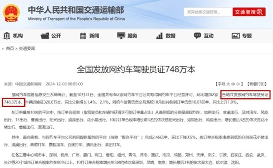 交通运输部数据显示,截至2024年10月31日,全国持证网约车驾驶员数量已达748.3万人。同时,一线城市网约车渗透率超过80%,运力过剩、司机收入腰斩成为常态。