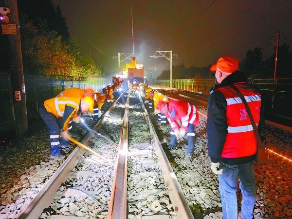 当晚10时30分,达成铁路蓬安至南充区间按规定封锁。此前,该区段一处钢轨检出“重伤”隐患,必须立即更换。中国铁路成都局集团有限公司遂宁工务段营山线路车间迅速组织20余名作业人员,利用宝贵的夜间“天窗点”投入抢修。