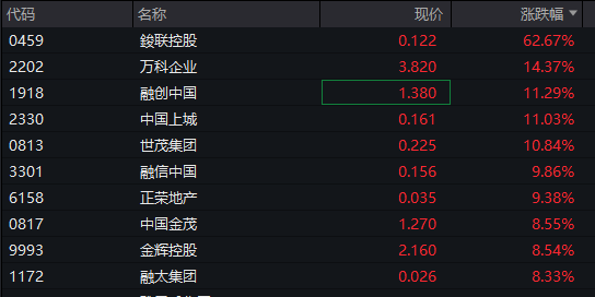 上证报中国证券网讯12月10日午后,港股房地产板块表现活跃,截至13时42分,鋑联控股涨逾60%,万科企业涨超14%,融创中国、中国上城、世贸集团涨超10%,融信中国等纷纷走高。