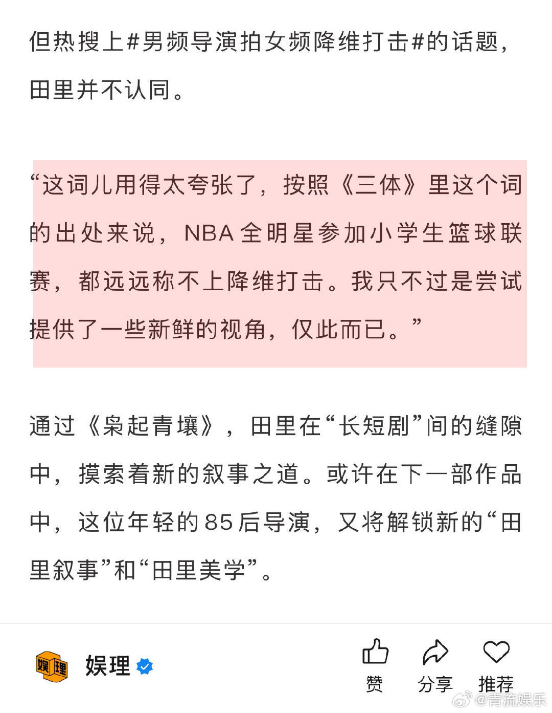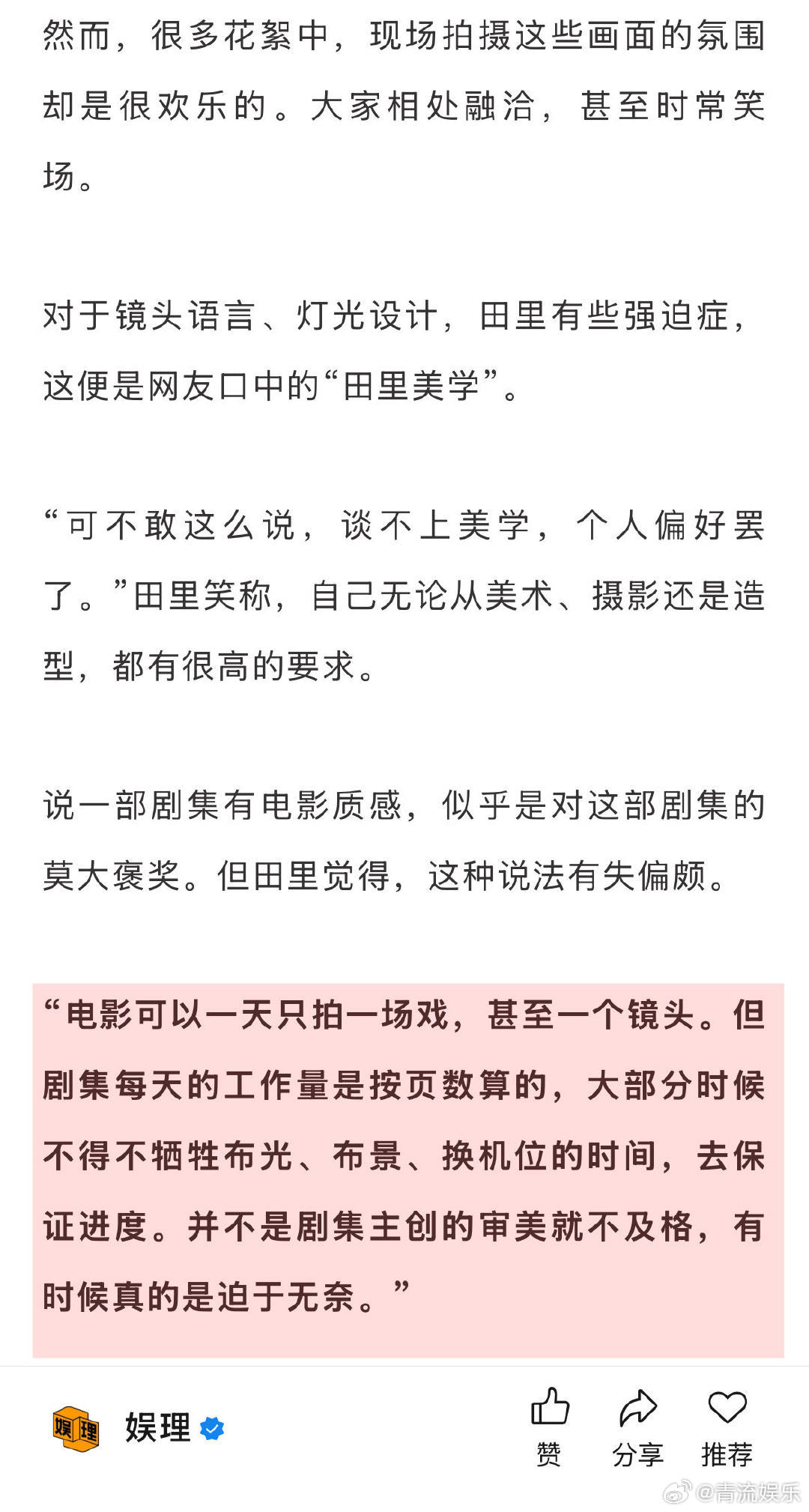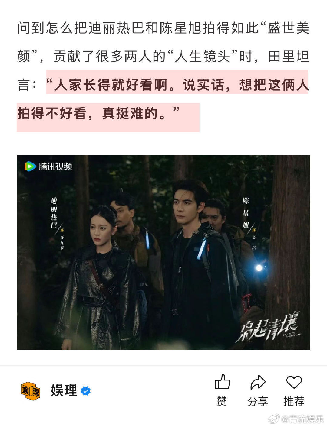 田里说迪丽热巴是导演友好型演员导演回应枭起青壤美学 《枭起青壤》中聂九罗和炎拓有三场吻戏,迪丽热巴跟陈星旭也会害羞,导演田里就拆解镜头,精准布光,细化到每一个动作幅度和眼神方向,用工作细节去化解尴尬。此外,聂九罗和炎拓的睡裙西装打戏,也来自于导演的精心设计,两个人在这场戏所穿的服装,以及后期剪辑时用的弗拉明戈风格的音乐,都是田里精心挑选的…电视剧枭起青壤