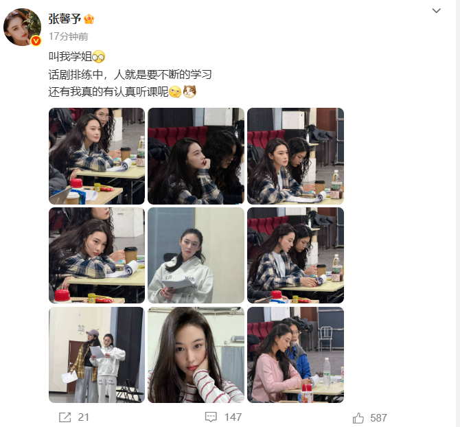 张馨予话剧排练张馨予学姐排练室里的每一个认真瞬间,都是学姐成长的印记,这份踏实与热忱太动人~