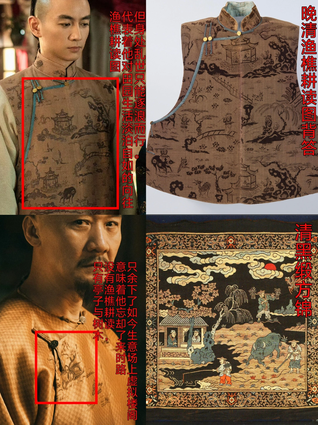✅古平原穿的衣服上是渔樵耕读图,代表着他对田园生活的恣意与淡泊自如的境界向往,但身处乱世只能逐浪而行。