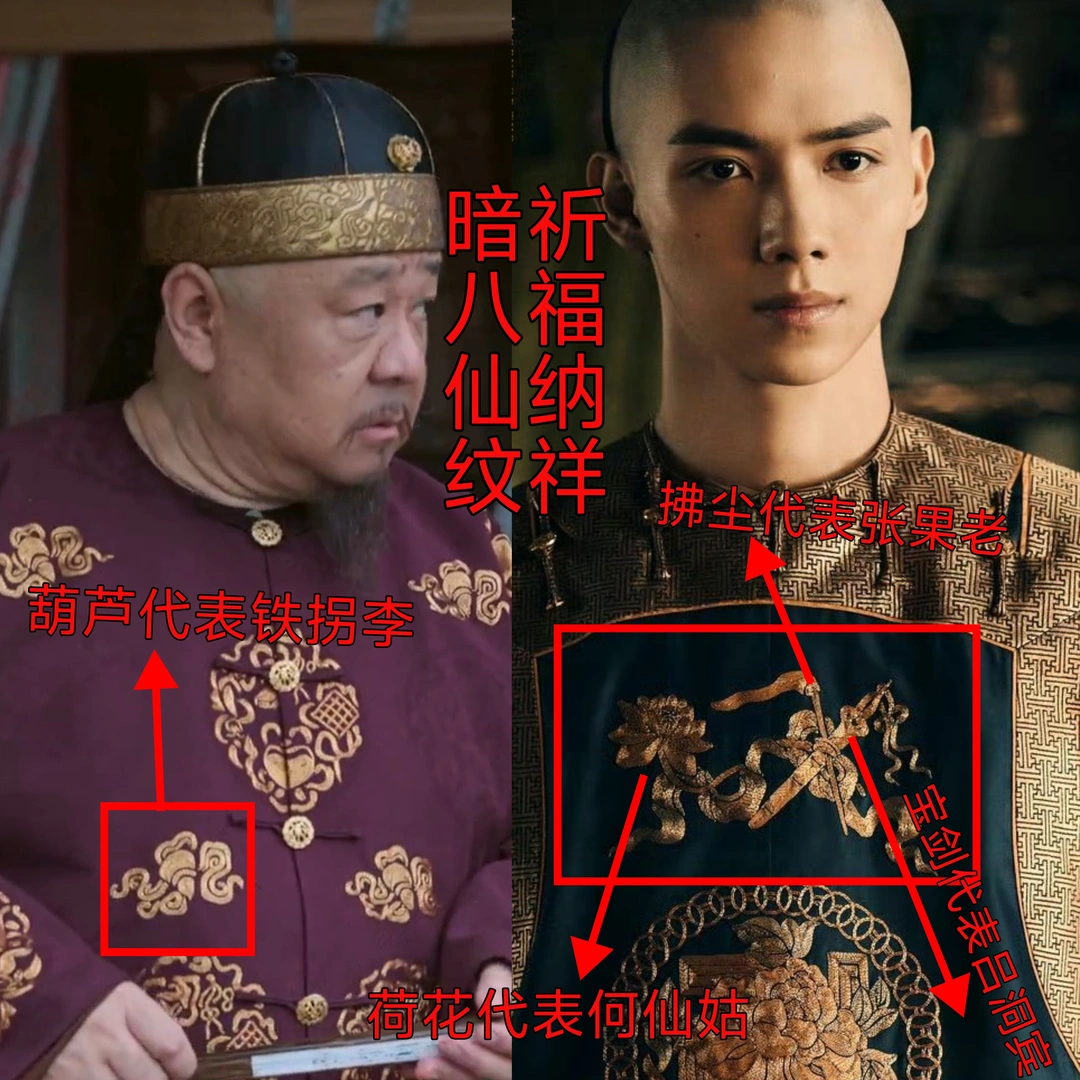 ✅李钦的衣服上有荷花、宝剑和拂尘,即何仙姑、吕洞宾和张果老。