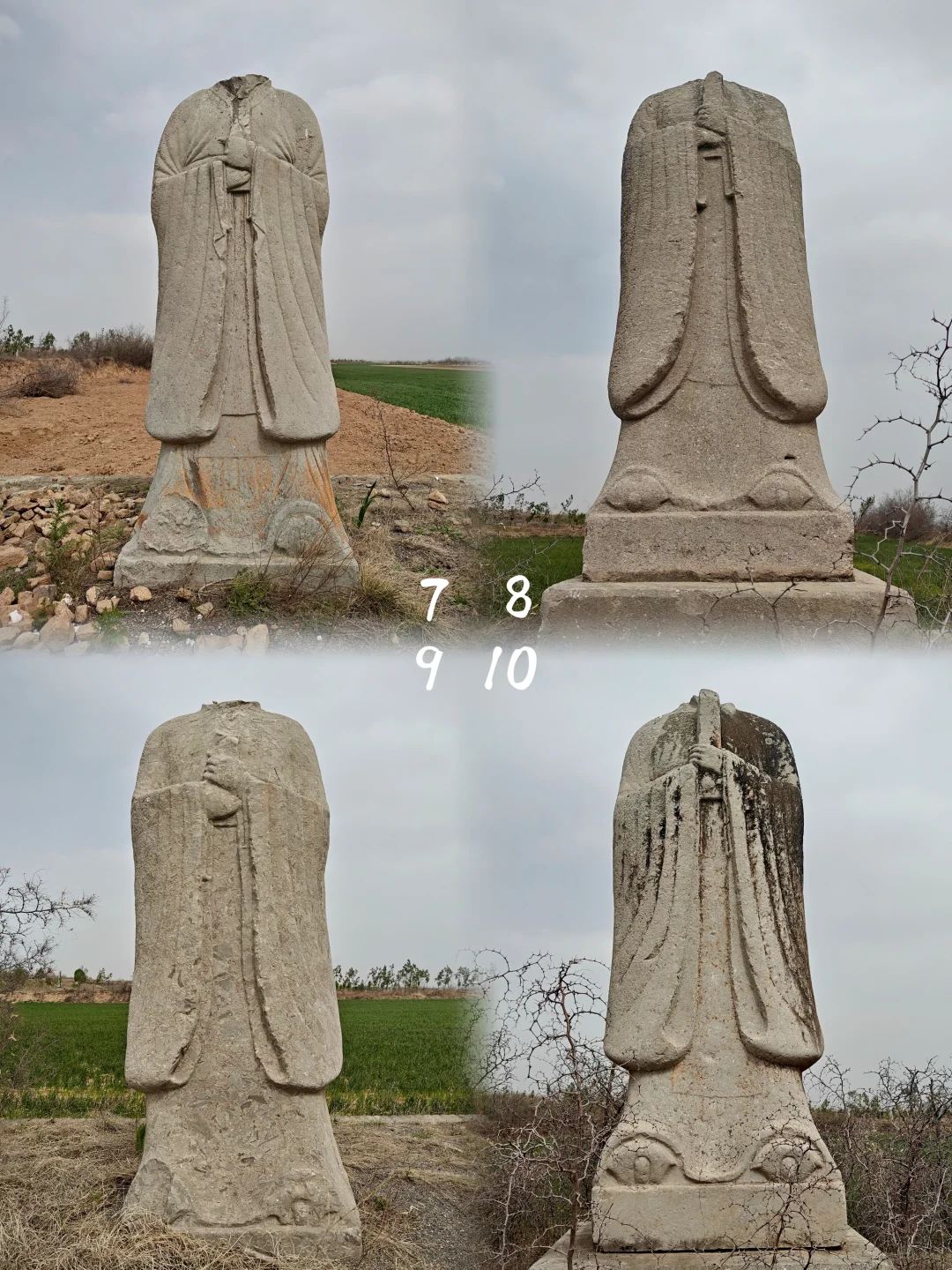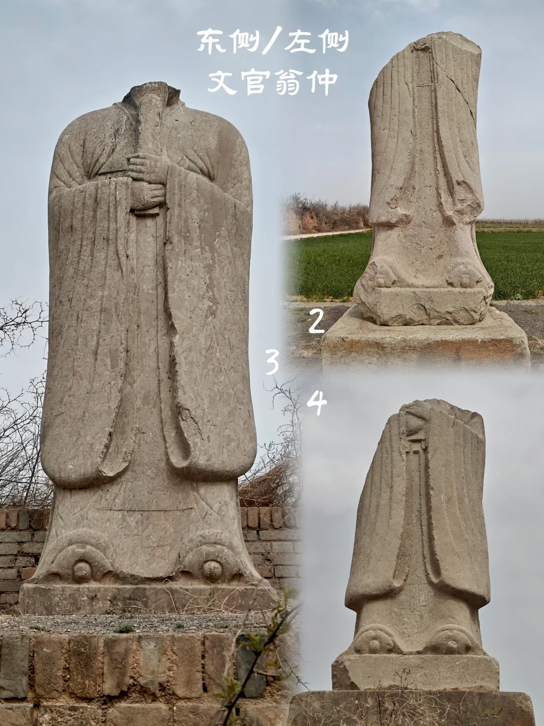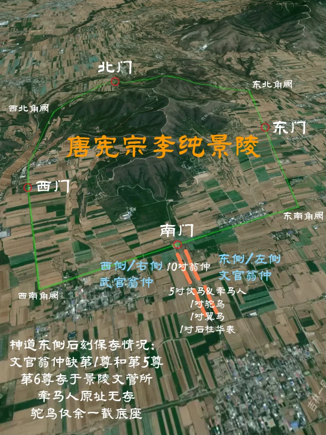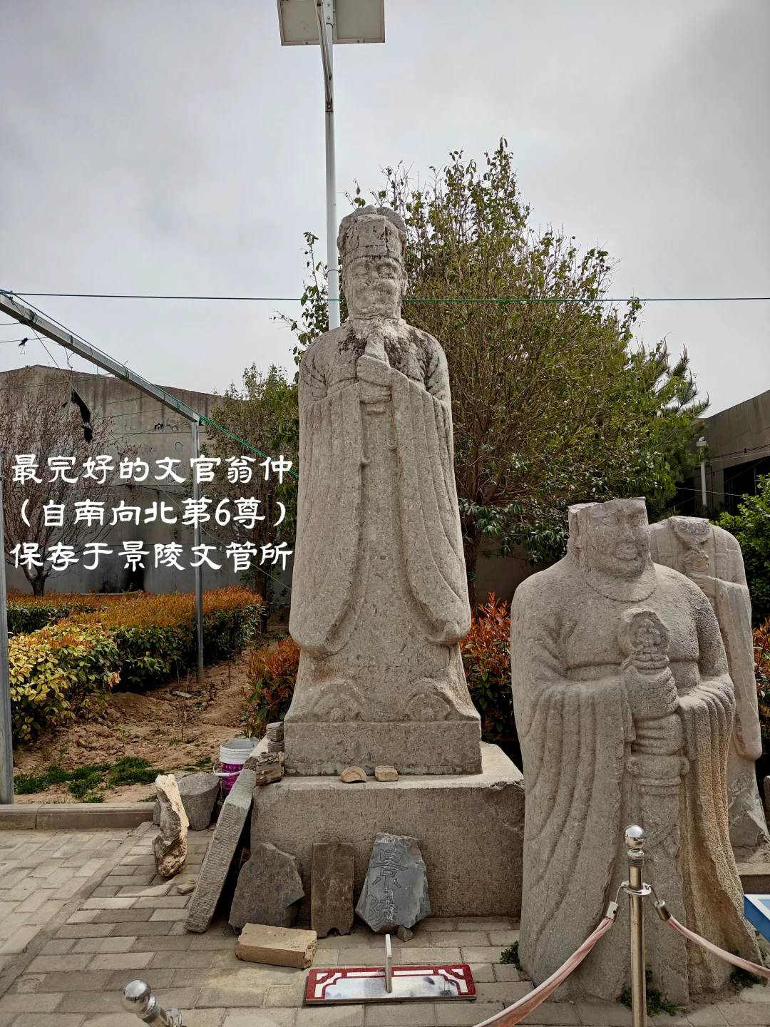 自唐高宗乾陵起形成定制,南门神道石刻自南向北依次为石柱华表1对、翼马1对、鸵鸟1对、仗马&牵马人5对、翁仲10对。唐玄宗泰陵开始,将翁仲改为左文右武(即东侧文官翁仲,西侧武官翁仲)。 目前唐宪宗景陵东侧神道石刻缺失情况: 1、鸵鸟仅余一截底座; 2、仗马部分,牵马人全部无存; 3、文官翁仲西南向北缺少第1尊、第5尊和第6尊。其中第6尊保存最为完好,存于景陵文管所。