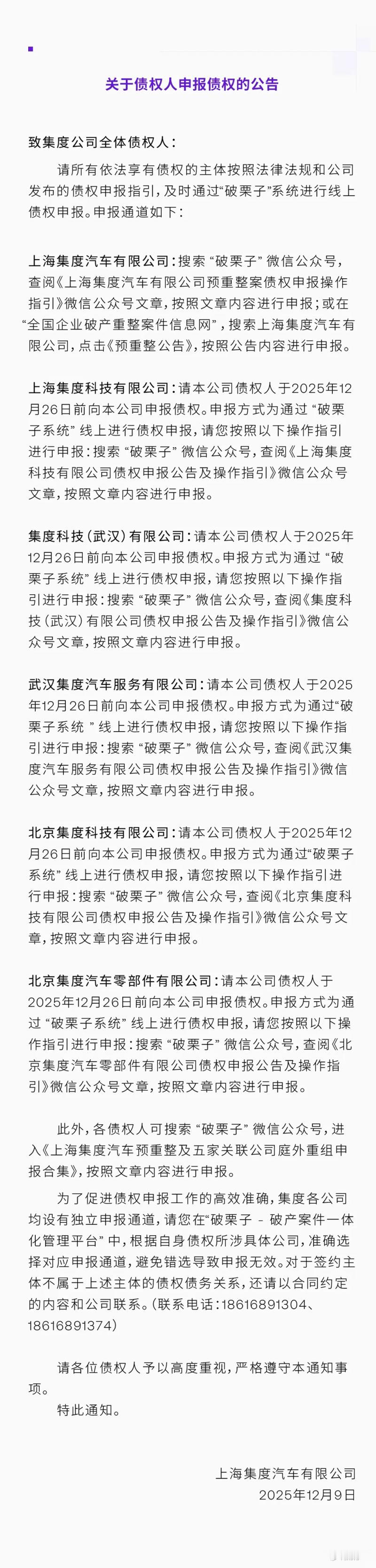 极越汽车这波操作有点“猛”!刚发了两份公告:《致全体债权人的通知》《关于债权人申报债权的公告》,核心就一句话:公司资产被非法侵占了,这直接影响预重整程序推进,还损害债权人权益[吃瓜群众]。公告里特别提到,谁占着公司的车、设备啥的,赶紧联系临时管理人交接;债权人也得线上申报债权。 说真的,新势力车企“过冬”本就不易,极越这节骨眼爆出资产被侵占,简直是“屋漏偏逢连夜雨”。预重整是救命稻草,现在被资产问题绊住脚,这步棋是自救前的“清障”,还是窟窿太大捂不住了?[思考] 大家觉得极越这波“壮士断腕”能盘活局面吗?新势力车企的资金链和资产安全,是不是该提上更高优先级了?评论区聊聊~[吃瓜群众]