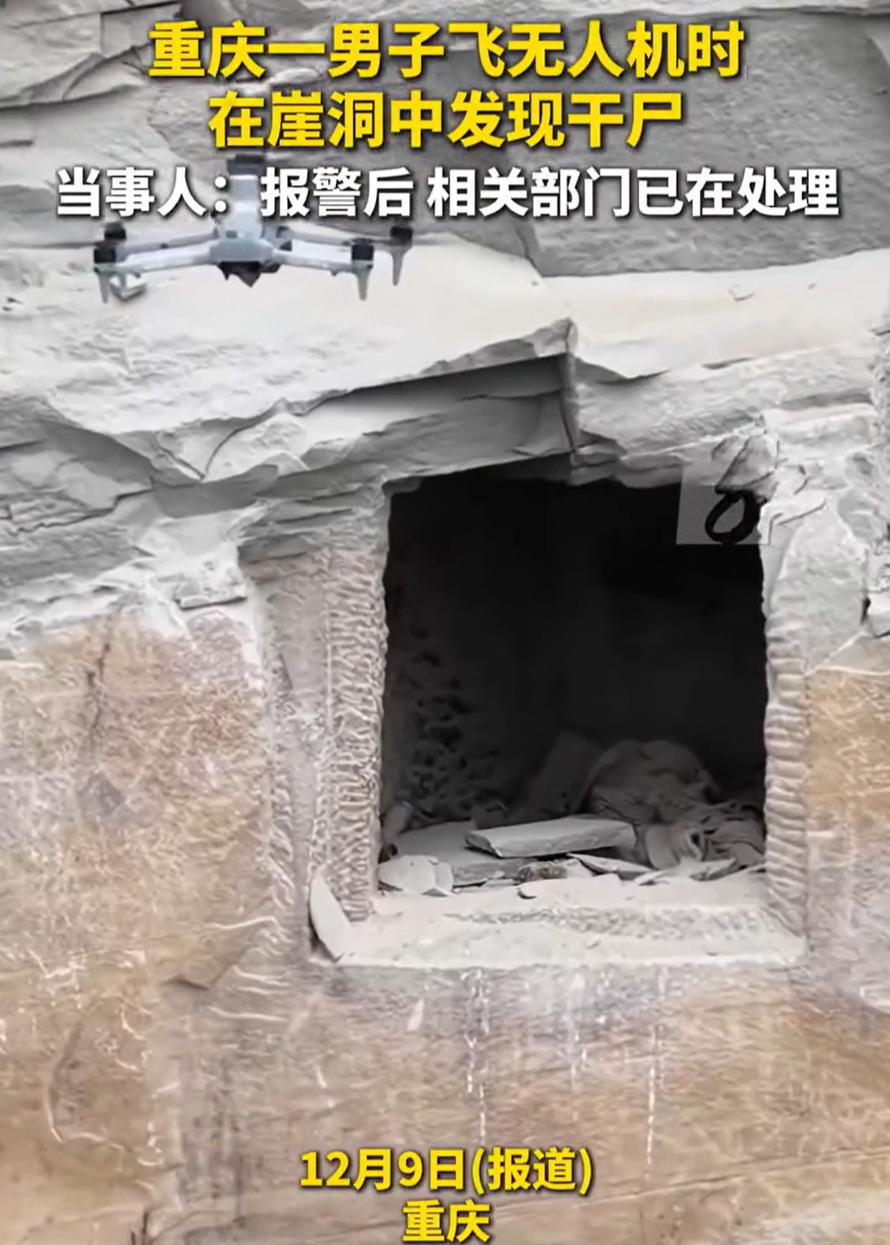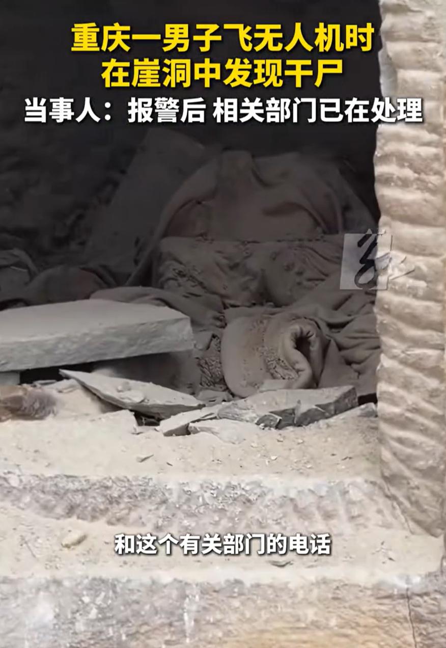 无人机又立大功了!重庆,一男子用无人机拍风景,偶然在一个崖洞中看到里面好像有物品,离近一看,里面不仅有毯子和一些生活物资,甚至还有一具干尸,男子也是迅速报警,网友们各种猜测 男子介绍,那个崖洞位置很偏,看上去有些年头了。无人机凑近后,能清楚看到洞里有毯子、塑料瓶,还有像是衣服的物件。再仔细看,毯子旁边似乎有个人形的轮廓。他感觉不太对劲,没敢耽搁,赶紧报了警 警方和相关部门很快到了现场。经过勘察,确认洞里确实有一具干尸。让人注意的是,这具干尸保存得比较完整,身材看起来也比较瘦削。有人联想到之前有名的楼兰小河公主遗存,就给这个发现起了个“龙河公主”的称呼,当然,这只是个民间叫法 事情传开后,网友们议论纷纷。有人猜是不是以前的隐士,有人联想到了古时候的悬棺习俗,也有人担心是不是什么案件的线索。各种说法都有,但都只是猜测 山洞可能几十年、上百年没人进去,不知道经历过什么。干尸身上没有明显破坏,东西摆放也比较有条理,更像是一个人曾经在这里待过一段时间,后来静静停在那里。具体身份、年代、原因,需要专业机构继续查,外人再怎么猜都不如事实来得准 我倒是觉得,无人机这几年确实改变了我们观察世界的角度,很多以前人迹罕至的地方,现在都能被我们看到。这次发现,不管最终调查结果如何,都提醒我们,这片土地上还有许多我们不知道的故事 山洞多年无人问,直到无人机飞过。一个小小设备,意外补上了一段被风吹散的痕迹。很多事情本就如此,看似偶然,其实也是一种遇见