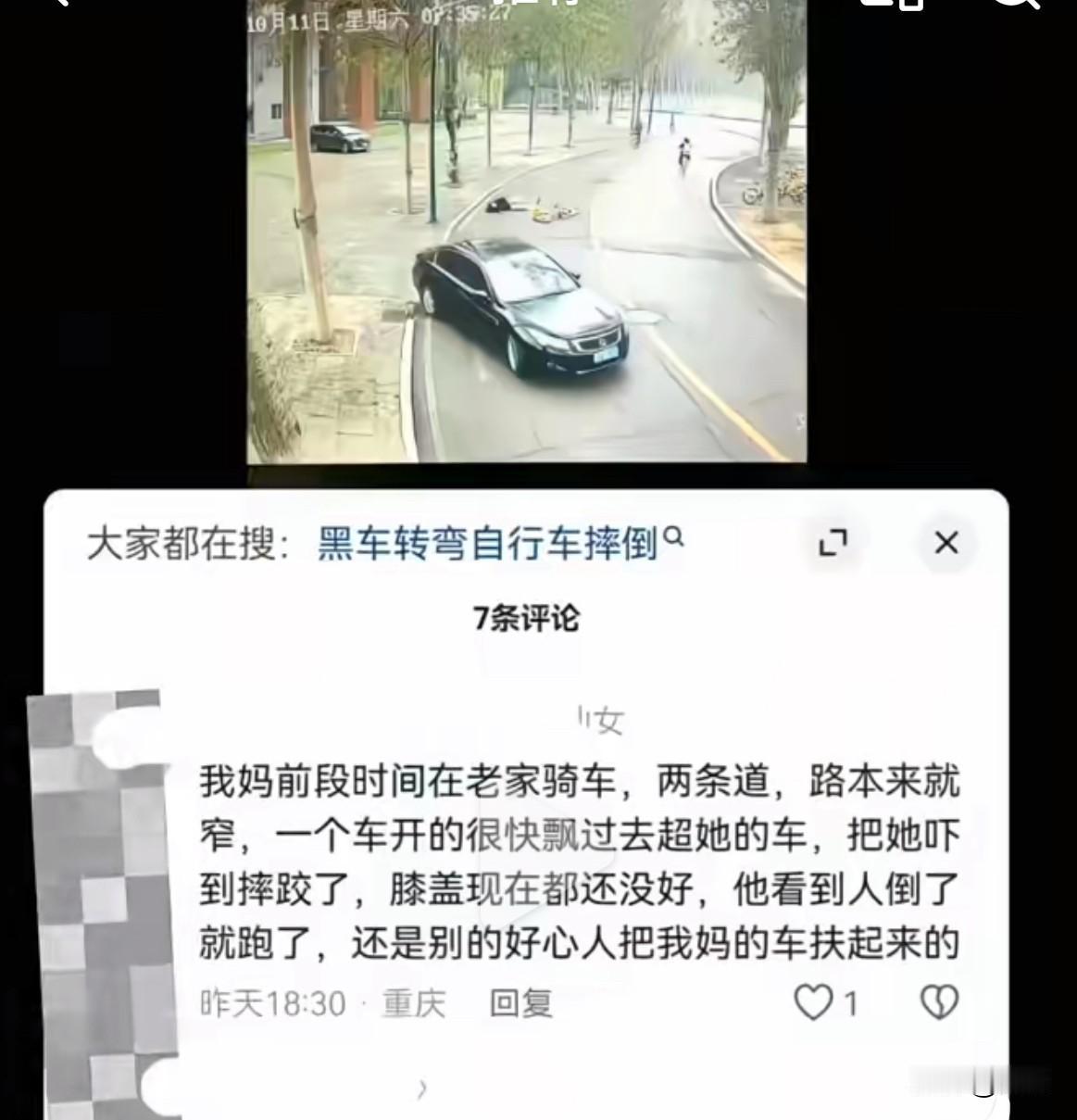 黑色轿车司机到底有没有责任? 一女子骑自行车时在马路上摔倒。家属在查看监控后认为,在这条本来就不宽的马路上,这辆黑色轿车开的很快的飘过去超她的车,把她吓得摔倒了,导致膝盖受伤。而这辆黑色轿车却扬长而去,不管不顾。 可以看到女子家属的言语之间,对黑色汽车颇有意见。 那么,大家认为黑色轿车该不该负责任呢?
