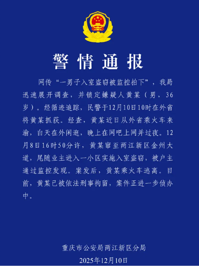 网传“一男子入室盗窃被监控拍下”,我局迅速展开调查,并锁定嫌疑人黄某(男,36岁)。经循迹追踪,民警于12月10日10时在外省将黄某抓获。经查,黄某近日从外省乘火车来渝,白天在外闲逛,晚上在网吧上网并过夜。12月8日16时50分许,黄某窜至两江新区金州大道,尾随业主进入一小区实施入室盗窃,被户主通过监控发现。案发后,黄某乘火车逃离。目前,黄某已被依法刑事拘留,案件正进一步侦办中。