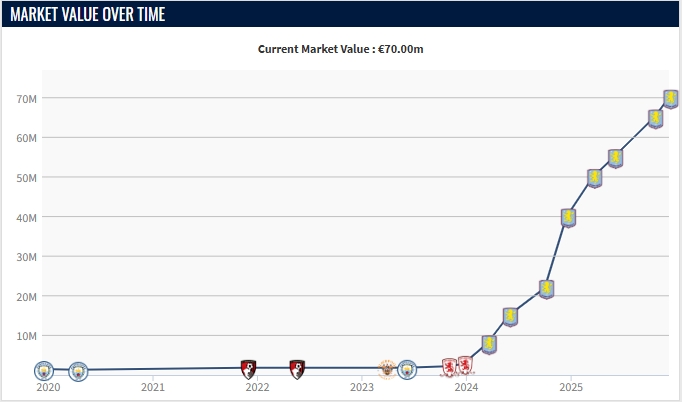 直播吧12月10日讯英超身价昨日进行了一次更新,阿斯顿维拉的中前场大核心摩根·罗杰斯身价涨至7000万欧。他加盟维拉之后,身价已经八连涨,从280万一路飙升到7000万。