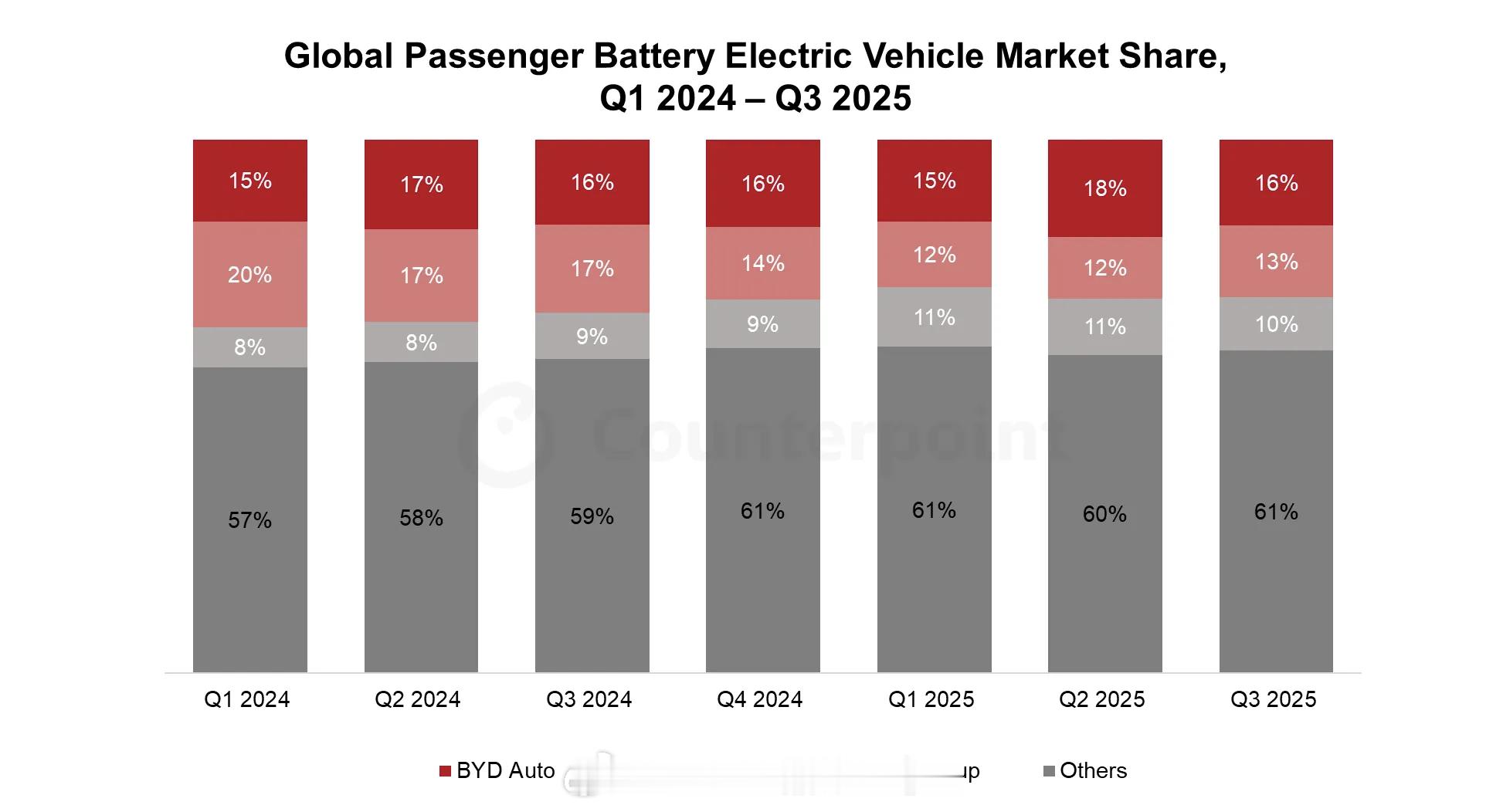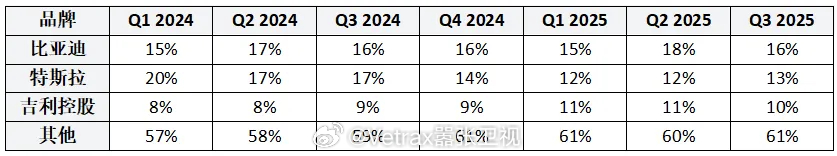 才发现这两年势头最猛的新能源汽车品牌其实是……吉利……Counterpoint 的全球电动汽车市场份额季度数据,比亚迪在 15-16% 的位置上非常稳定,而特斯拉则是从 20% 的份额上滑坡到 13% 第二的位置,而这一年吉利从 8% 的全球份额稳步推进到 10%,成为全球纯电汽车的第三名。而且吉利的星愿成为了本季度全球最畅销的三款电动车之一。· 2025 年 Q3 全球新能源汽车销量同比大幅增长 32%。· 纯电动车(BEV)继续占据主导地位,占全球电动汽车销量的三分之二,其销量较去年同比增长 32%。插电式混合动力汽车(PHEV)也实现温和增长,同比增长 6%。· 本季度 BEV 普及率创下新高,占全球乘用车销量的 18%,高于去年同期的 14%。· 中国仍是全球增长的核心动力,贡献了全球 BEV 销量的 60%,其后依次为欧洲和美国。· 特斯拉 Model Y、吉利 Galaxy 星愿以及特斯拉 Model 3 成为本季度全球最畅销的三款电动车。TOP 3 品牌各家的具体情况:· 比亚迪集团在 2025 年 Q3 以近 60 万辆的 BEV 继续稳居全球市场第一,同比增长 33%。该公司在欧洲、东南亚和拉美等海外市场表现强劲,出口量超过 15 万辆,海外市场贡献率达 27%。比亚迪的核心优势在于 BEV 和 PHEV 的多样化产品布局,尤其在紧凑型 SUV 和轿车市场表现突出,通过具备竞争力的定价和规模效应保持领先。2025 年 Q3 比亚迪海鸥、海豚和元 UP 是其最畅销的三款车型。· 特斯拉以超过 13% 的全球份额排名第二,2025 年 Q3 销量同比增长 7%。今年特斯拉销量提升主要受益于改款 Model Y 的强劲表现,以及在中国推出的长轴距版 Model Y。此外,由于美国消费者赶在 2025 年 10 月 EV 税收抵免取消前抢购,推动特斯拉在美国市场的销量增长。· 吉利控股集团以 10% 的全球 BEV 市场份额位列全球第三,2025 年 Q3 BEV 销量同比增长 51%。集团旗下银河与极氪两大品牌在中国经济型及中端电动车市场表现突出,持续推动销量增长。吉利通过“实惠定价 + 先进软件”的组合策略,在竞争激烈的中国市场持续赢得消费者青睐。旗下品牌中,吉利银河贡献了集团 BEV 总销量的一半以上。Galaxy 星愿、Galaxy E5 和几何熊猫 MINI EV 是其最畅销车型。