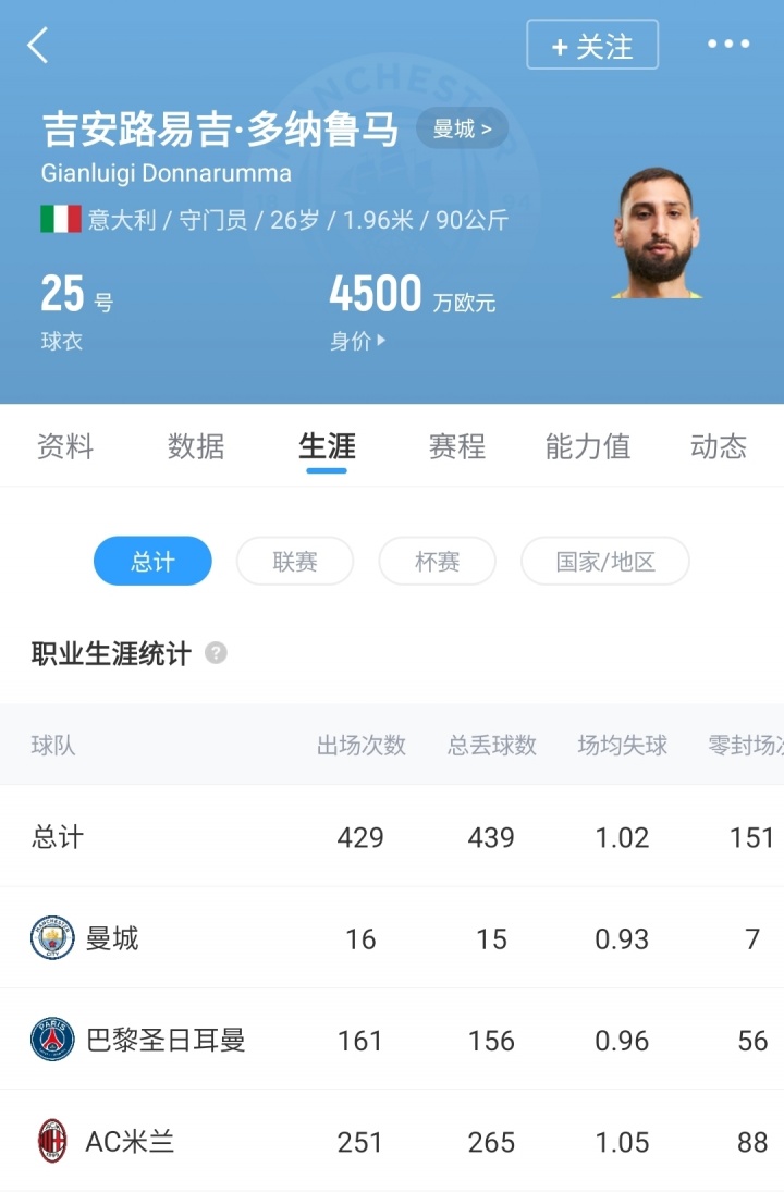 多纳鲁马今夏以3000万欧转会费从巴黎加盟曼城,本赛季共为曼城出战16场比赛,丢15球完成7场零封。