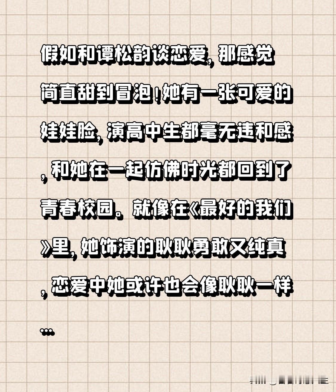 假如和谭松韵谈恋爱,那感觉简直甜到冒泡!她有一张可爱的娃娃脸,演高中生都毫无违和感,和她在一起仿佛时光都回到了青春校园。 就像在《最好的我们》里,她饰演的耿耿勇敢又纯真,恋爱中她或许也会像耿耿一样,为你默默付出。还有《旋风少女》里,她和吴磊的互动可爱俏皮,和她恋爱生活中肯定充满了欢声笑语。 她演戏时表情丰富,生活里想必也如此鲜活。想象着和她像戏里的情侣一样,相互关心、打打闹闹,那一定是超甜蜜又难忘的体验。 谭松韵 谭松韵演技派 明星 [赞][赞][赞]