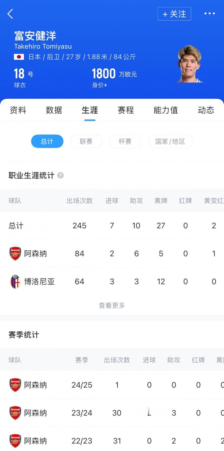 富安健洋现年27岁,2021年阿森纳花费1860万欧元将其从博洛尼亚签下,效力阿森纳4年,富安健洋总计出场84次,贡献2球6助。目前富安健洋德转身价为1800万欧元。