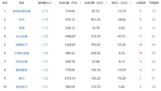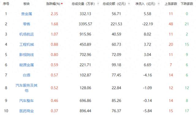 板块方面,贵金属、零售、机场航运等板块涨幅居前,其他电源设备、元件、贸易等板块跌幅居前。