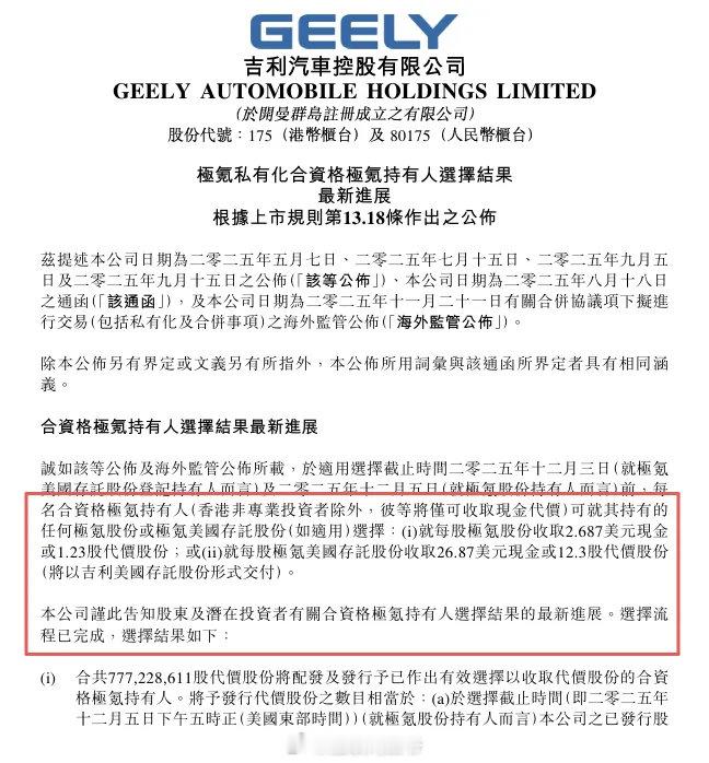 吉利和极氪合并的事儿终于到收尾阶段了!12 月 9 号吉利发了公告,极氪股东里超七成都没选拿现金,反而选了换吉利的股票,光要发的股票就有 7.77 亿股要知道现在吉利股价和极氪股东能拿到的现金对价差不多,真想快进快出套现,选现金多干脆?但七成股东偏不,这明摆着是看好吉利和极氪合并后的长期前景。而且吉利自己也在给市场打气,10 月就说要最多花 23 亿港元回购股票,12 月 8 号已经真金白银砸了 2711 多万港元,回购了 153.4 万股,管理层敢这么干,就是对自家发展有十足的信心按照计划,月底(12 月 29 号前)两家就能完成合并,到时候吉利从主流到豪华市场都覆盖了,动力类型也全了。现在股东用换股 “投票”,公司用回购托底,这波都能看出来,大家对 “一个吉利” 的未来是真有底气!