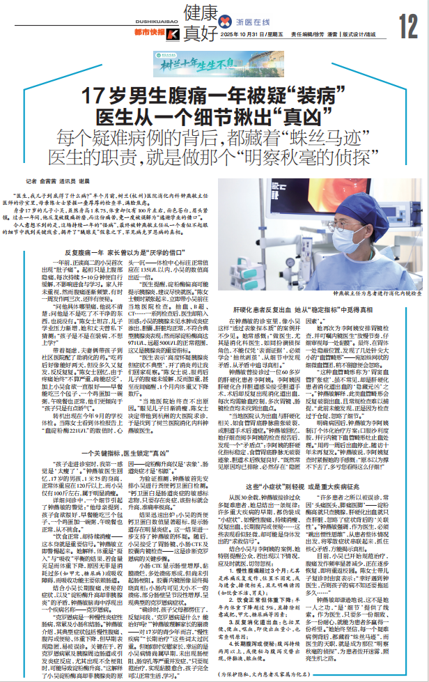 直到一个多月前,他看见了《都市快报》的那篇报道《17岁男生腹痛一年被疑“装病”,医生从一个细节揪出“真凶”》,于是立即带着报纸,劝说小希再次到医院就诊,这次他们出现在了树兰(杭州)医院消化内科副主任钟燕敏主任医师的门诊。