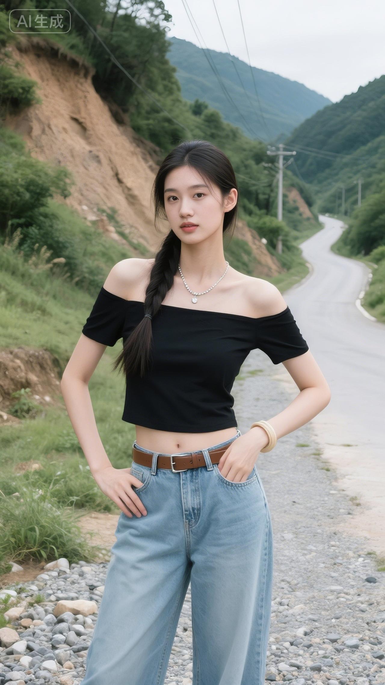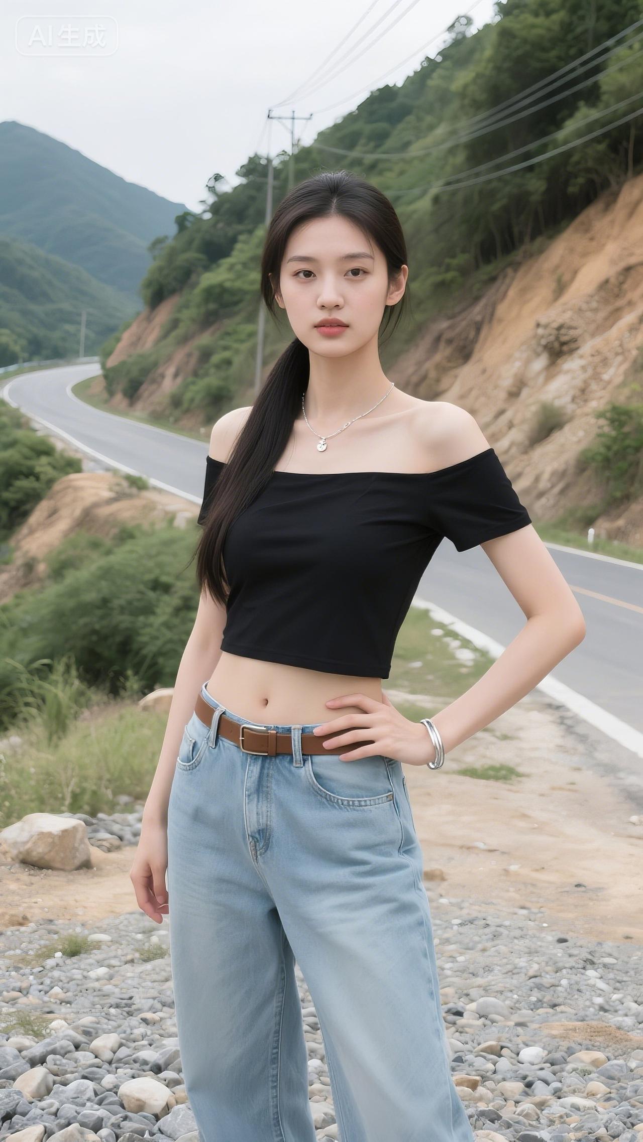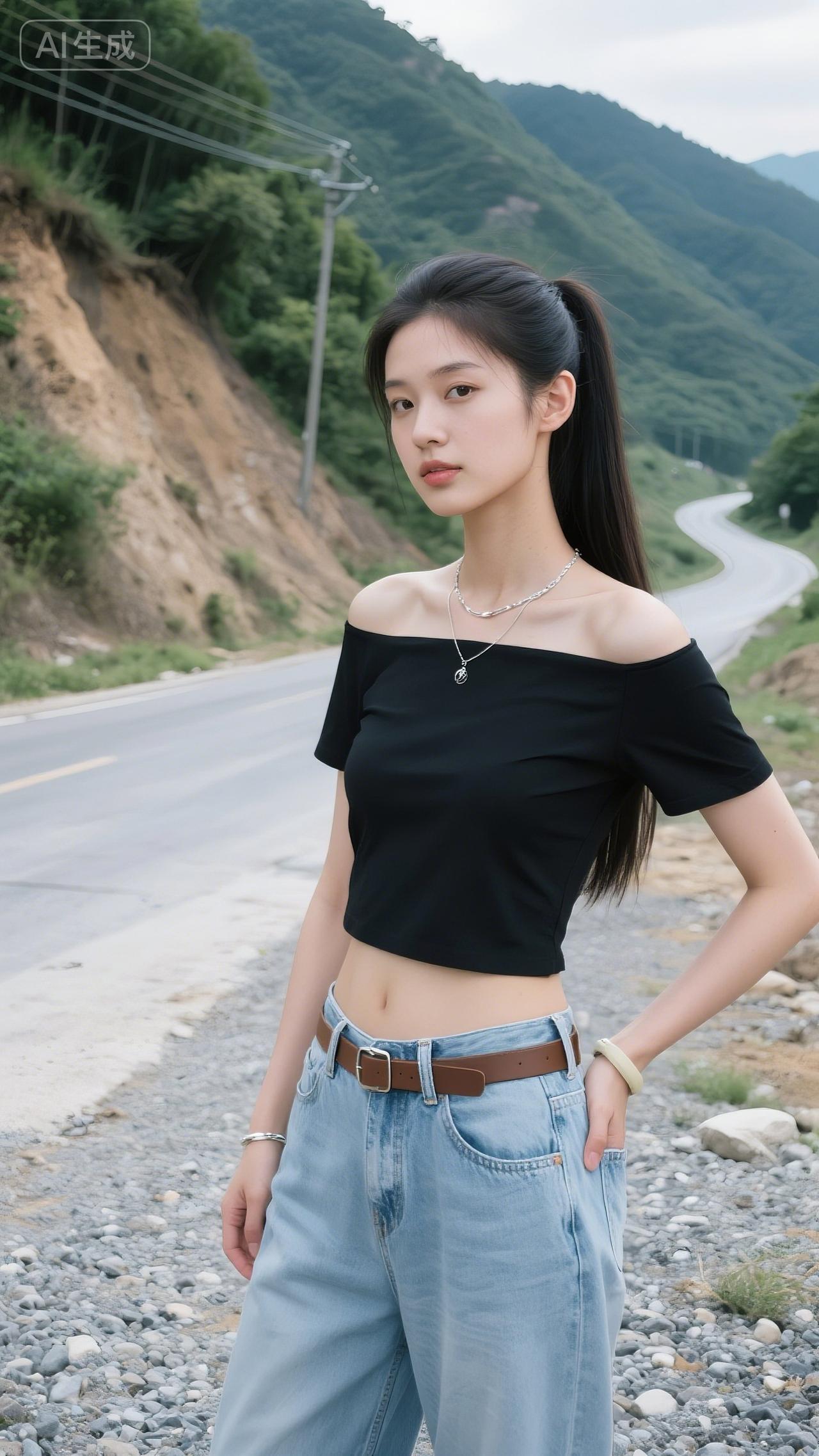 山间公路旁,露肩黑衫配阔腿牛仔,高马尾编出随性,她往那儿一站,连风都染上了松弛的