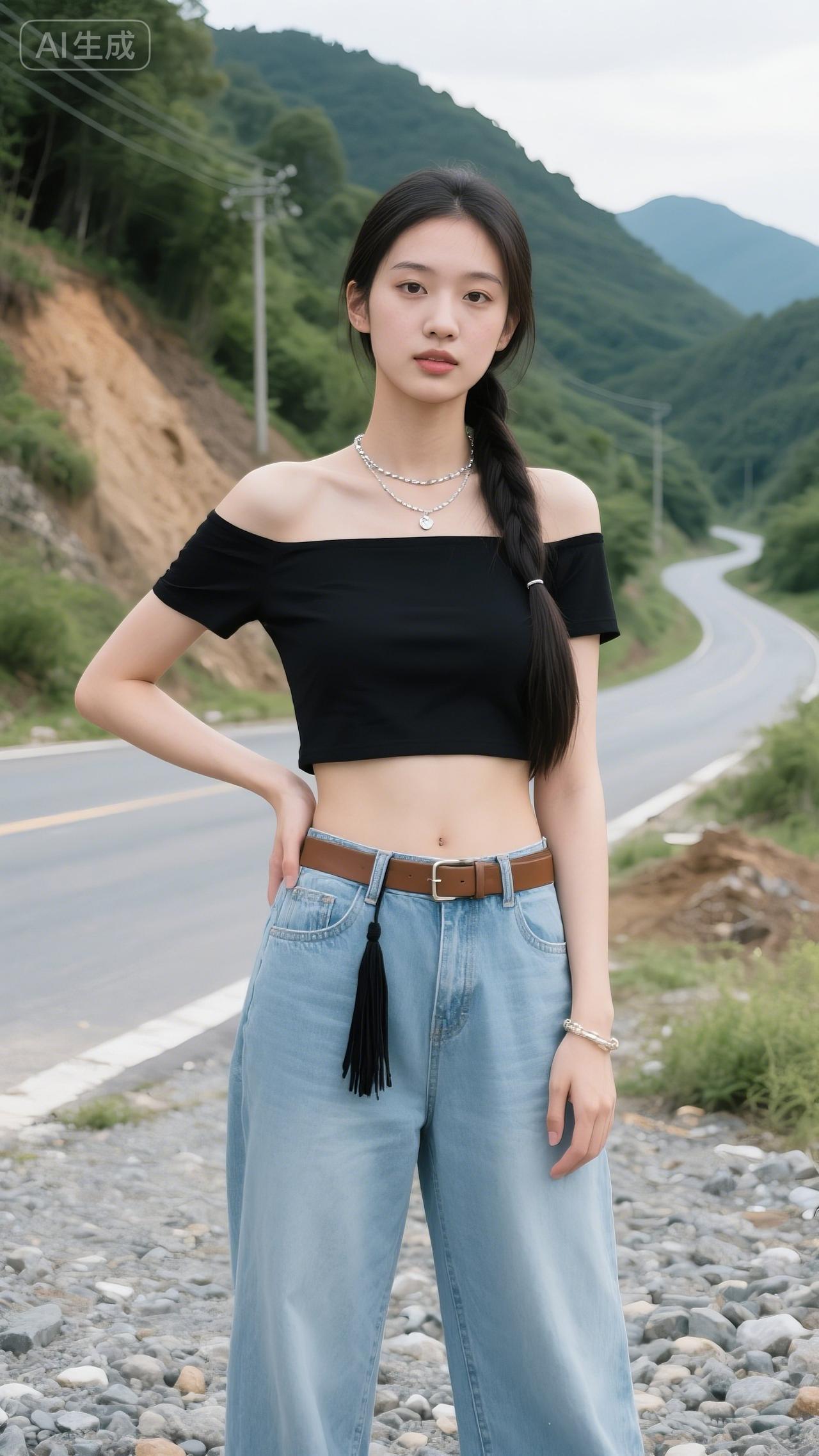 山间公路旁,露肩黑衫配阔腿牛仔,高马尾编出随性,她往那儿一站,连风都染上了松弛的美。通勤牛仔穿搭 简约穿搭牛仔裙 休闲上衣牛仔裙 牛仔通勤写真