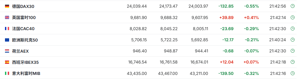正在交易的欧洲股市涨跌不一,德国DAX指数现跌0.55%,英国富时100指数涨0.41%,法国CAC40指数跌0.29%。