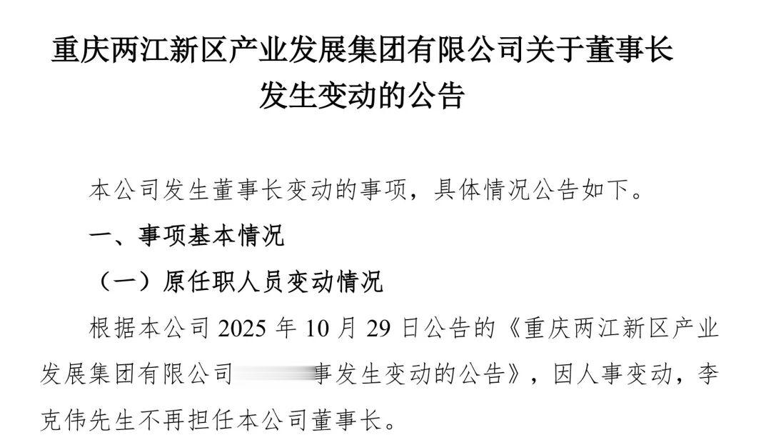 12月9日,重庆两江新区产业发展集团有限公司发布公告称,公司董事长发生变动,李克伟不再担任该职,由谢静接任。