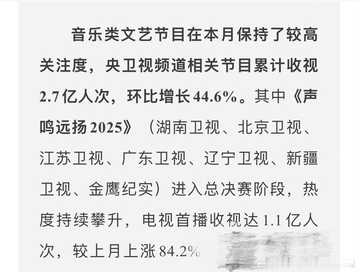 声鸣远扬收视达1.1亿远超同期声鸣远扬 首播就拿下1.1亿收视,占比近四成,音综赛道妥妥的佼佼者
