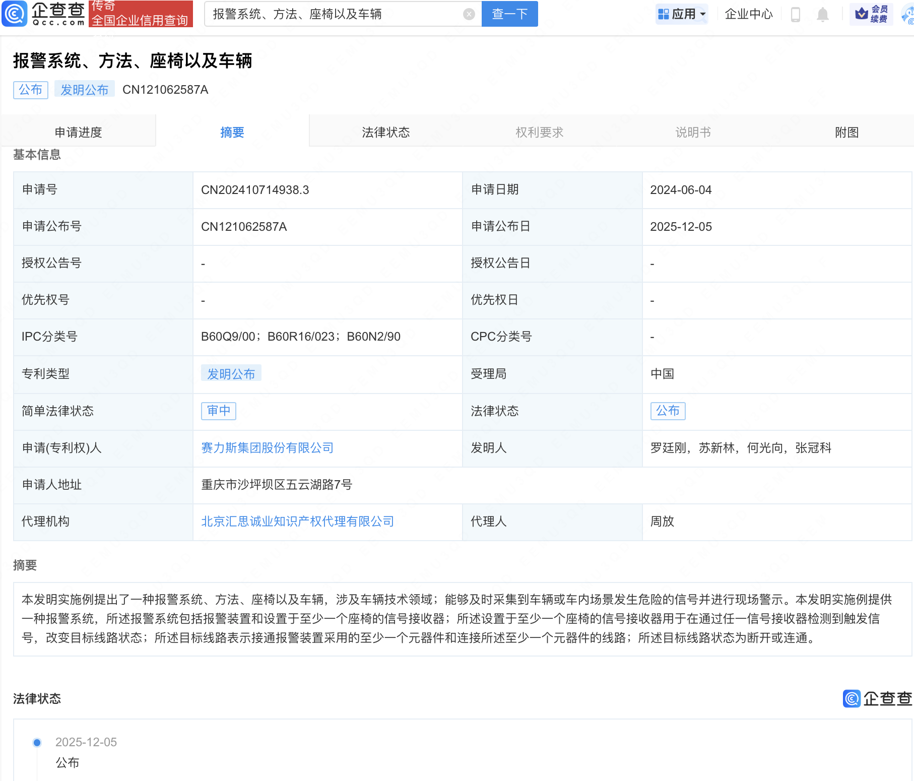 企查查APP显示,近日,赛力斯(601127)“报警系统、方法、座椅以及车辆”专利公布。企查查专利摘要显示,本发明涉及车辆技术领域,能够及时采集到车辆或车内场景发生危险的信号并进行现场警示。本发明实施例提供一种报警系统,所述报警系统包括报警装置和设置于至少一个座椅的信号接收器;所述设置于至少一个座椅的信号接收器用于在通过任一信号接收器检测到触发信号,改变目标线路状态;所述目标线路表示接通报警装置采用的至少一个元器件和连接所述至少一个元器件的线路;所述目标线路状态为断开或连通。