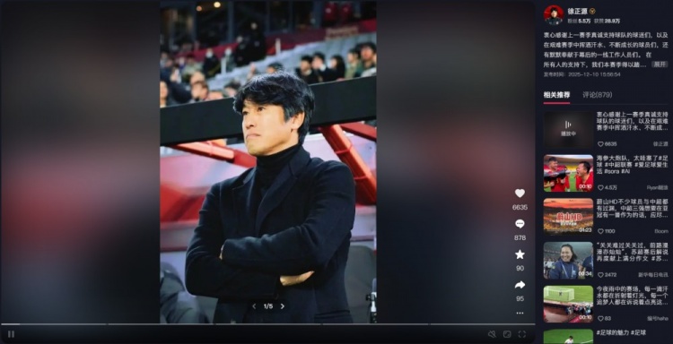直播吧12月10日讯在昨晚结束客战神户胜利船的亚冠精英联赛后,成都蓉城也随之完成了今年全部的正式比赛。今晚蓉城队主教练徐正源更新社交媒体账号,总结这个刚刚结束的赛季。