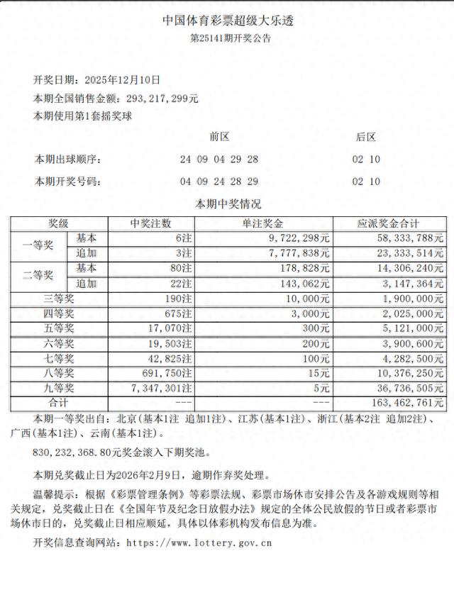 大皖新闻讯中国体育彩票超级大乐透第25141期开奖公告发布,本期一等奖出自:北京(基本1注追加1注)、江苏(基本1注)、浙江(基本2注追加2注)、广西(基本1注)、云南(基本1注)。
