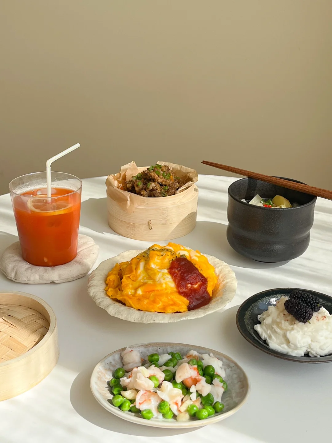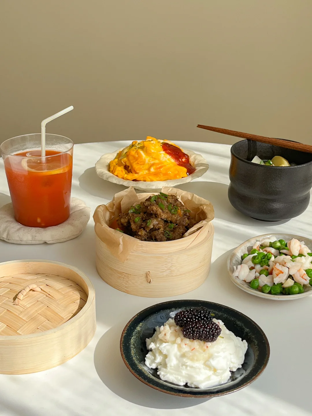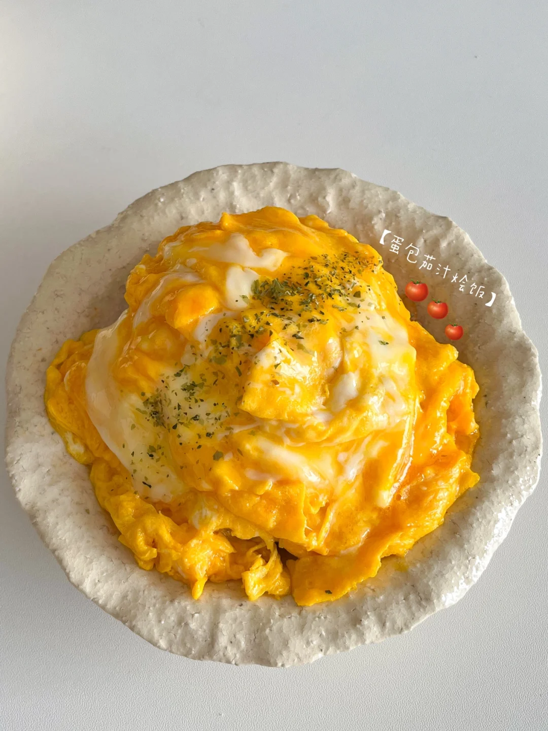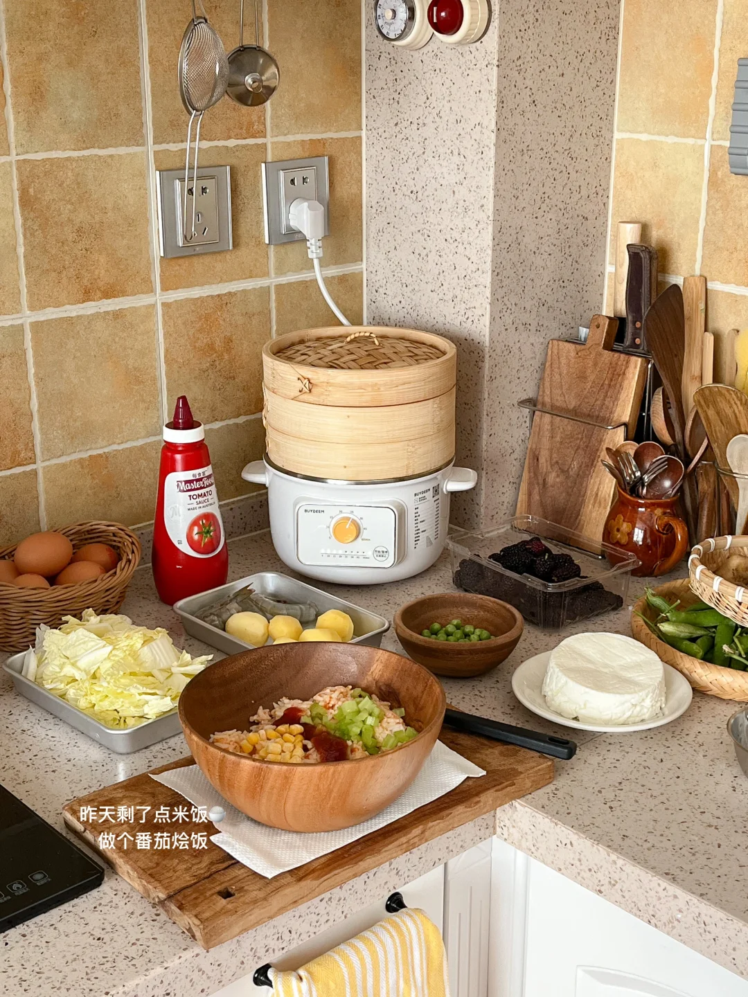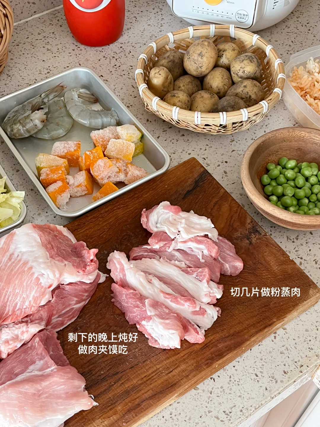 今天的饭: 蛋包茄汁烩饭🍅 豌豆鲜虾仁🍤 薯仔煮白菜汤🥔 南瓜粉蒸肉🍖 桑葚酒酿酸奶🍨 鲜榨番茄汁🧃
