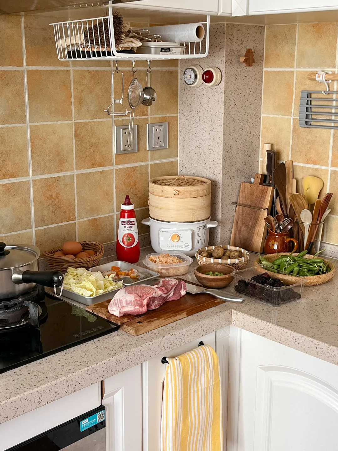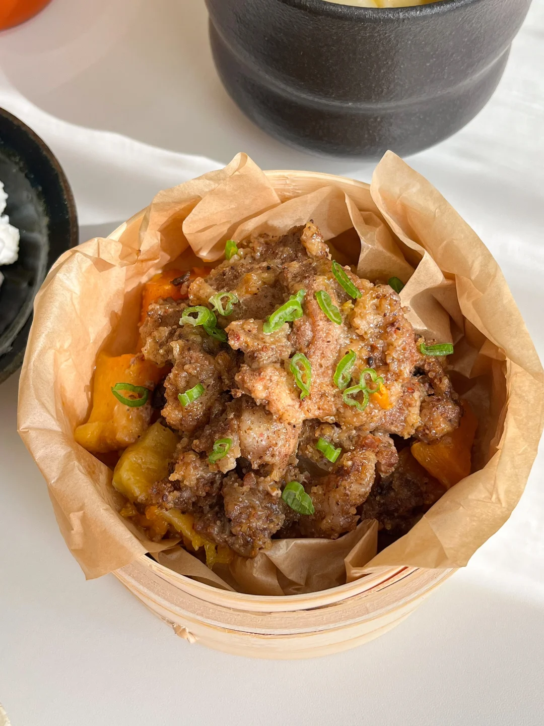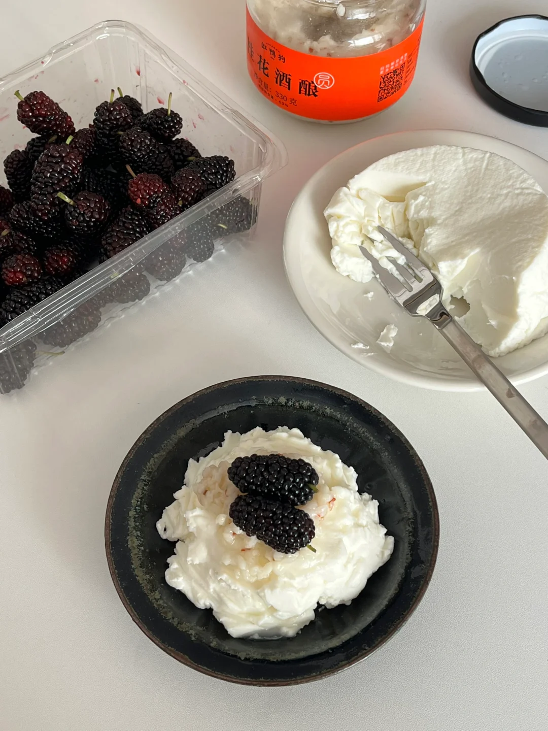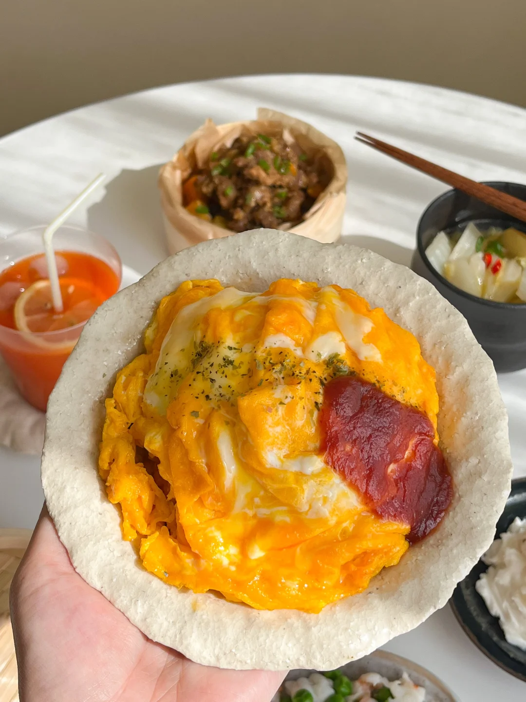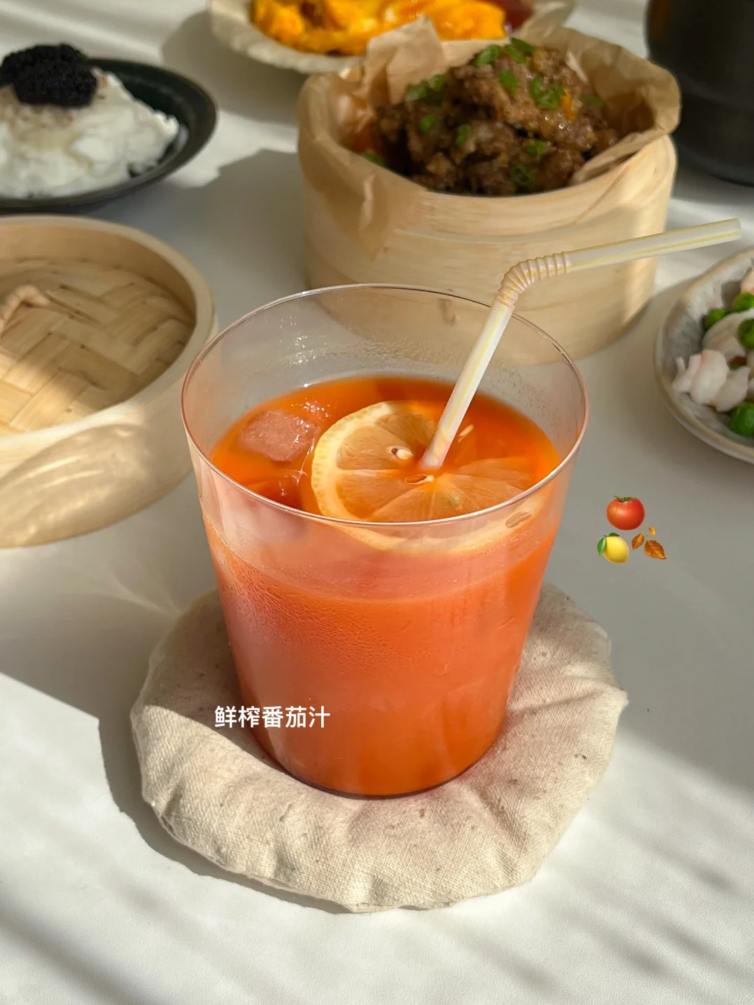 今天的饭: 蛋包茄汁烩饭🍅 豌豆鲜虾仁🍤 薯仔煮白菜汤🥔 南瓜粉蒸肉🍖 桑葚酒酿酸奶🍨 鲜榨番茄汁🧃
