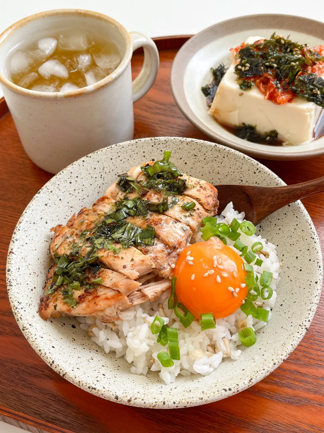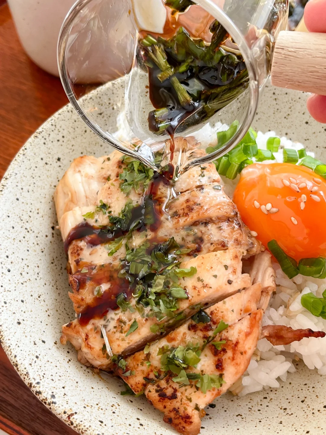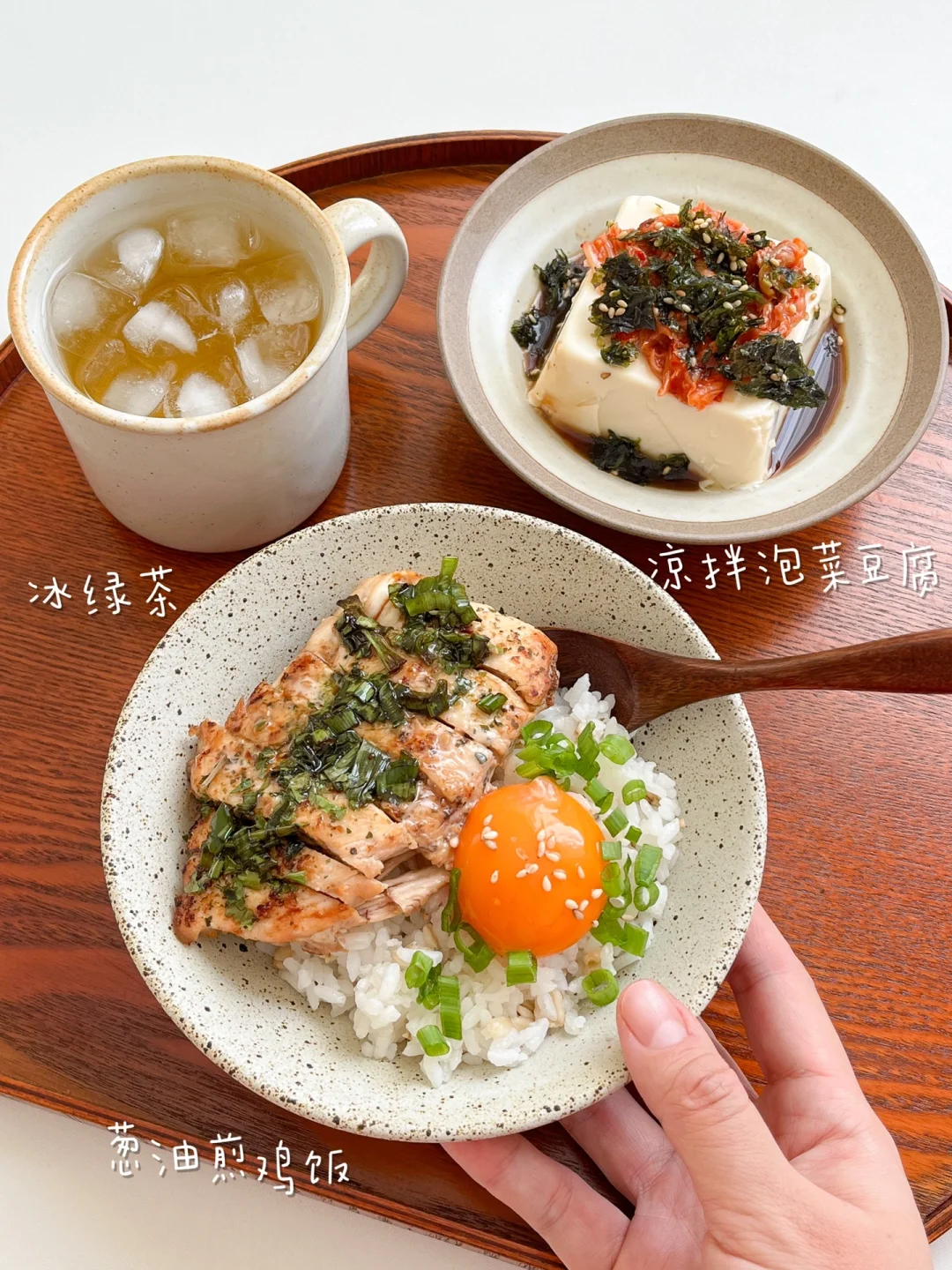 鸡胸肉对半切开,放大蒜盐和一点花生油腌制,平底锅煎熟。平时吃葱油拌面总会剩下一点酱汁,淋在鸡肉上再拌上米饭真的很好吃!小香葱的味道让鸡胸肉都美味了😋