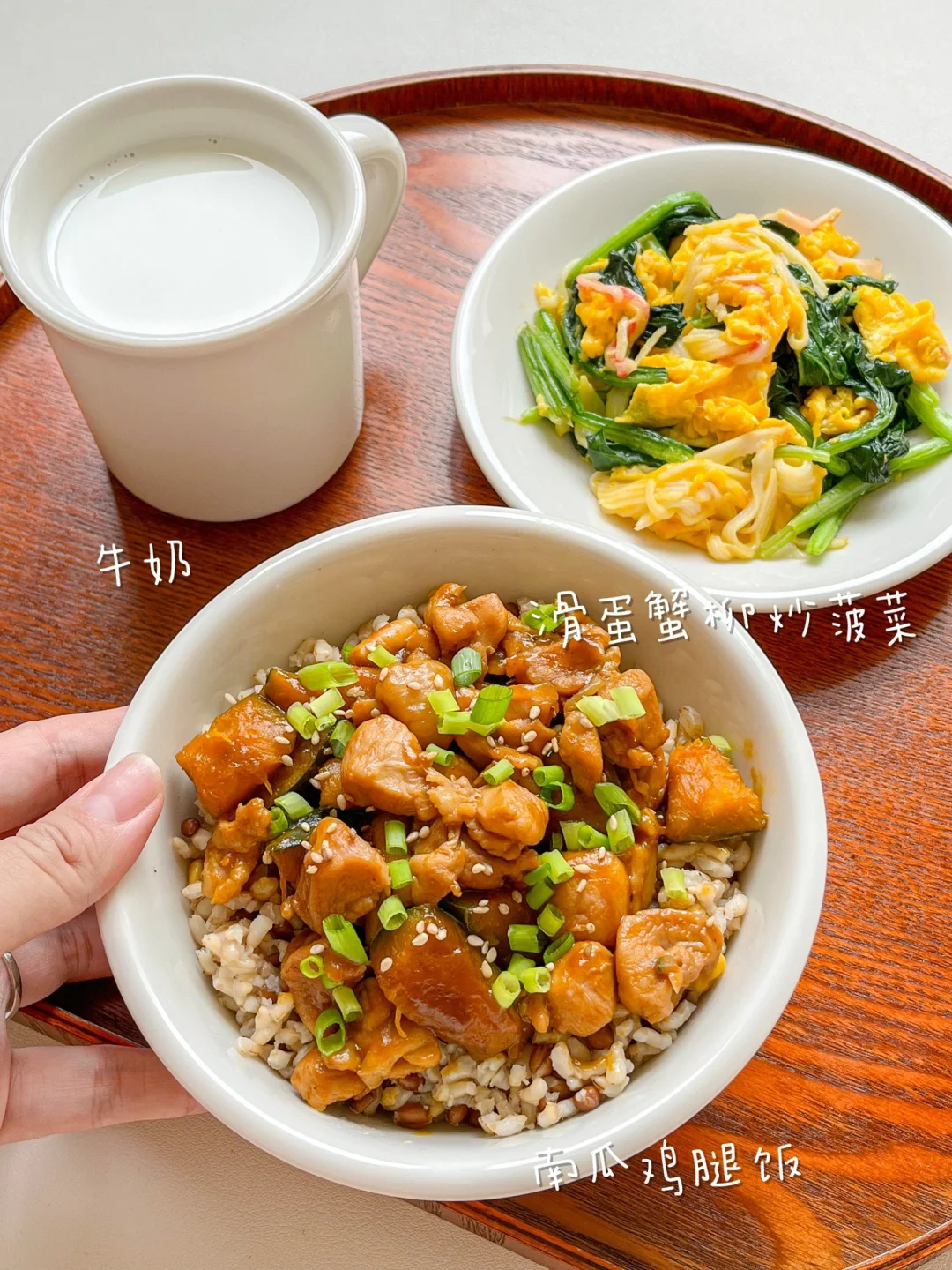 “贝贝南瓜是甜甜,有南瓜的香甜和板栗的粉糯,我喜欢炖着吃!个头小小的,很适合减脂期一个人吃!” 今日午餐: ¹贝贝南瓜炖鸡肉饭 ²滑蛋蟹柳炒菠菜 ³牛奶
